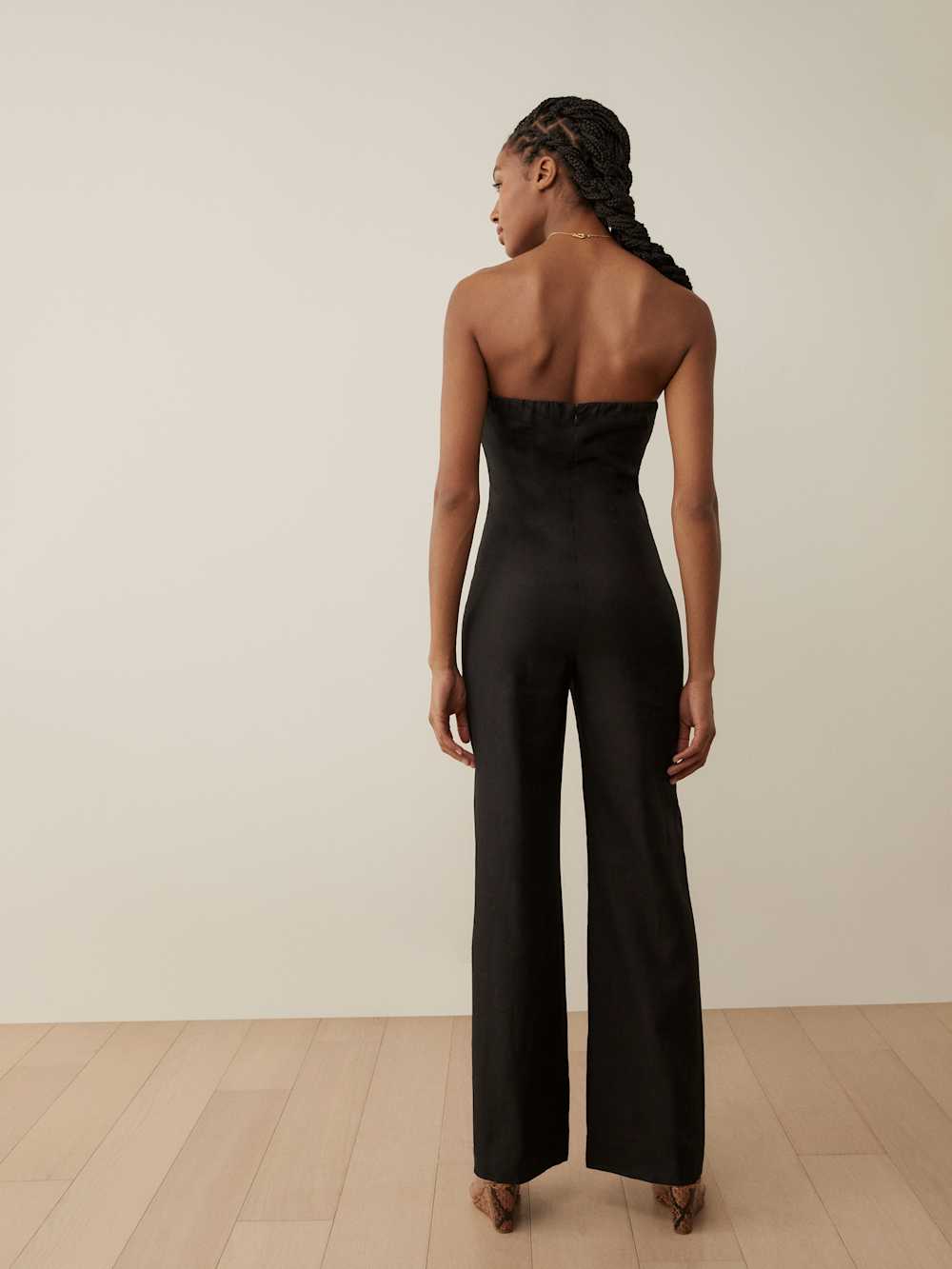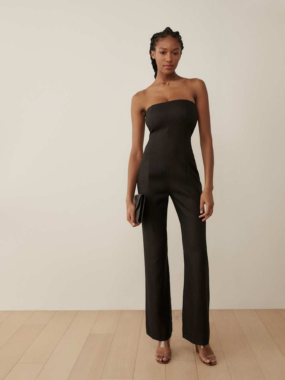 One and done. Shop the Jude Linen Jumpsuit from Reformation, a full length, strapless jumpsuit that is fitted in the bodice with flared legs.