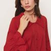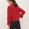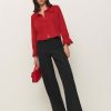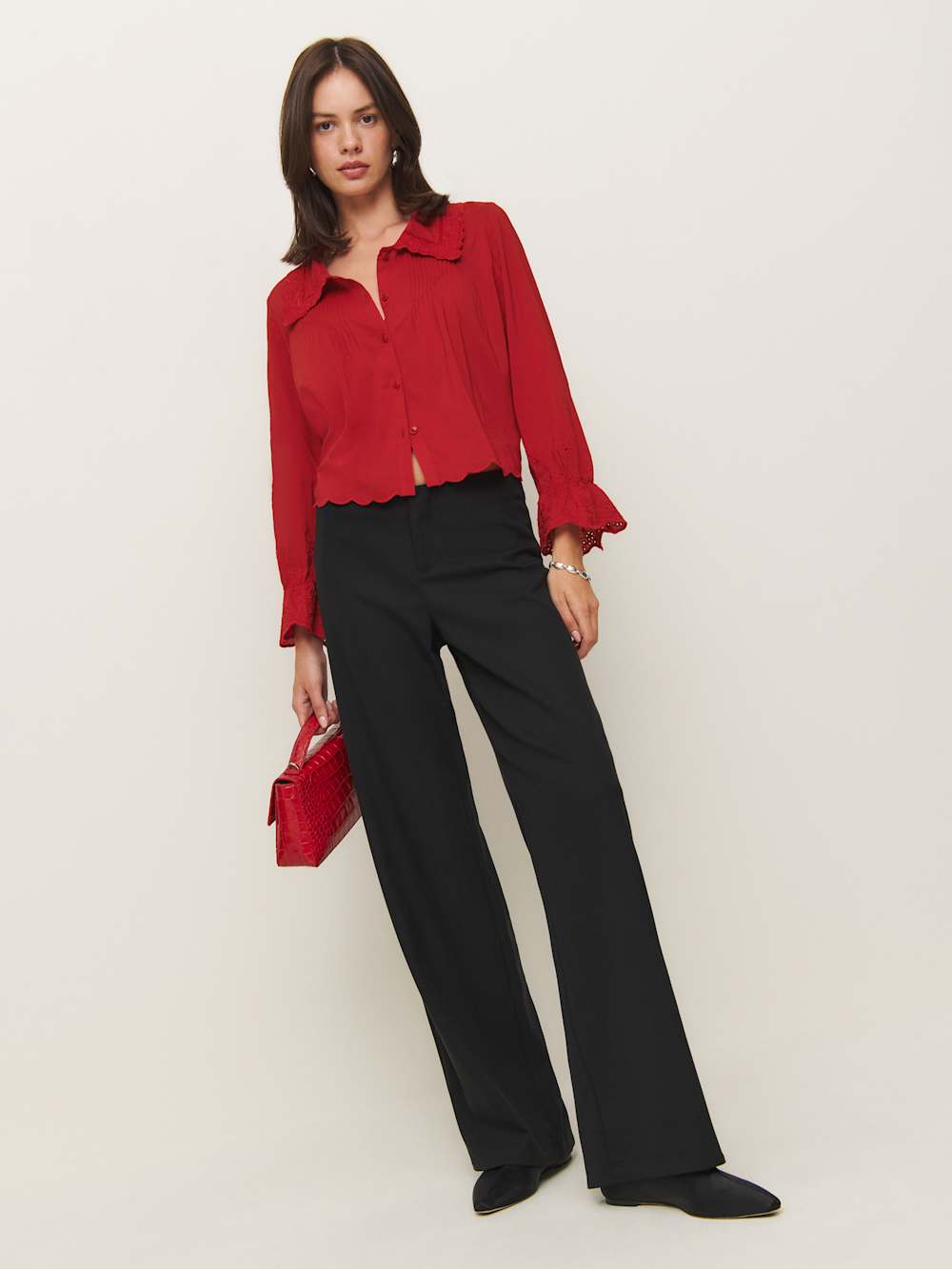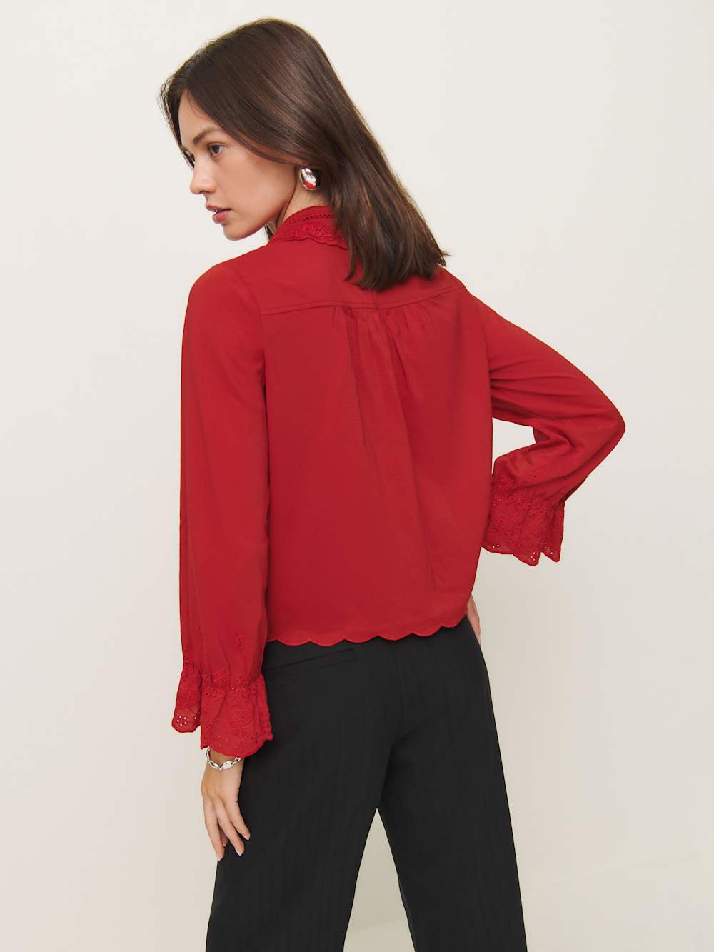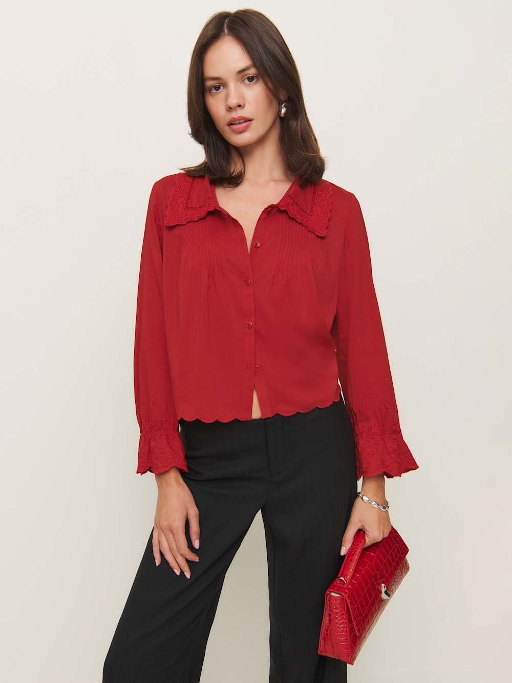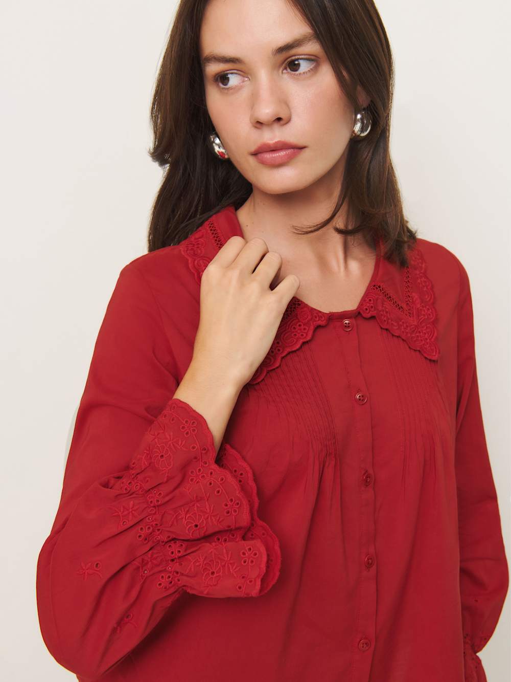 Romance alert. Shop the Juni Top from Reformation, a long sleeve top with a collared neckline, cinching at the wrist, and embroidered details throughout.