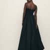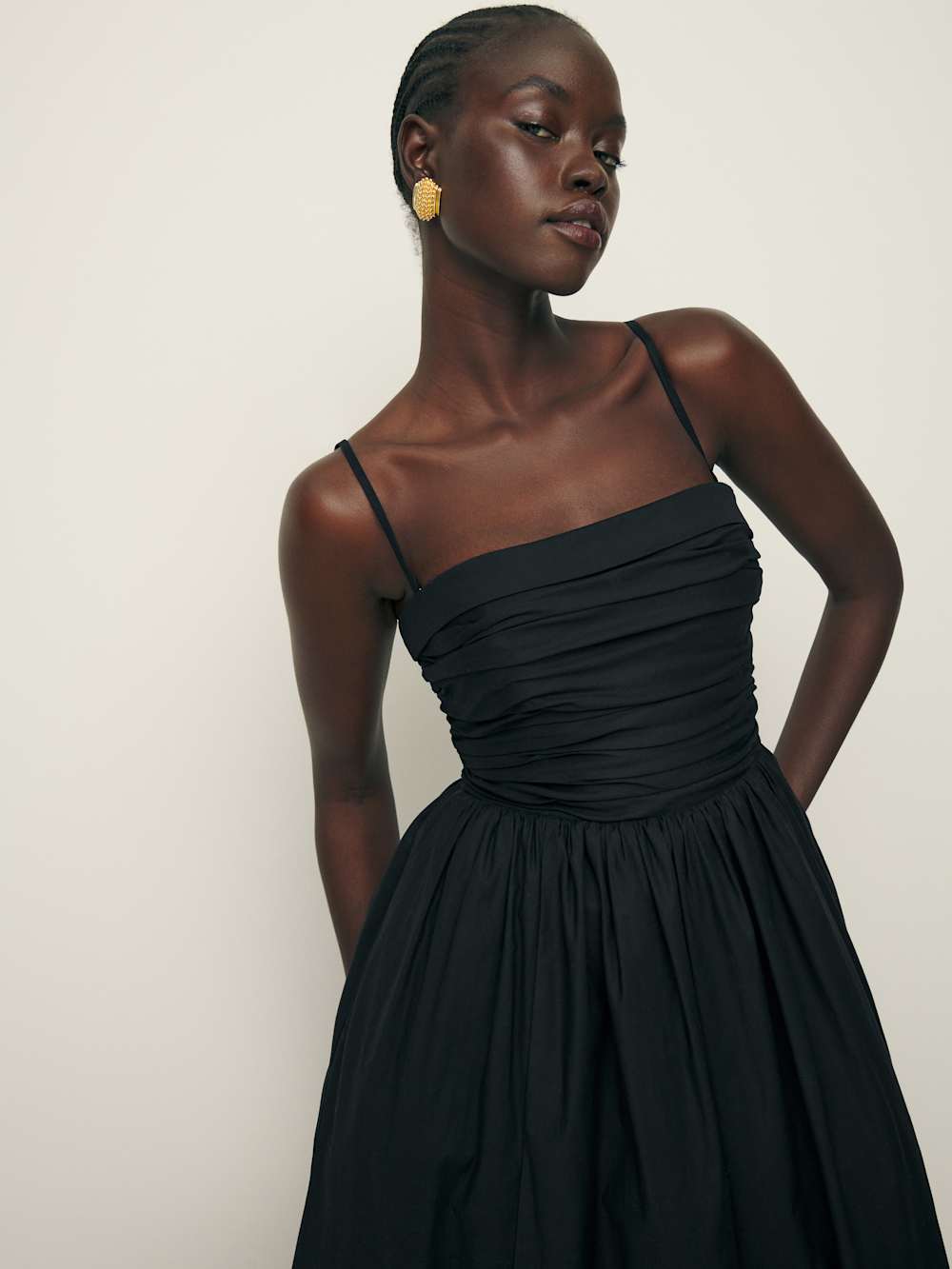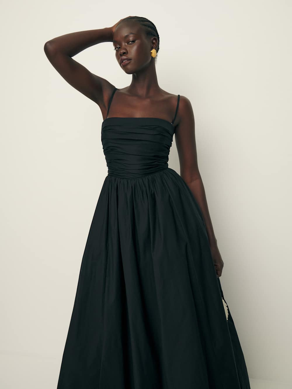 Weddings are in the air. Shop the Kastoria Dress from Reformation, a fitted maxi dress with a straight neckline, a-line skirt, and a pleated front.