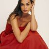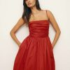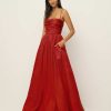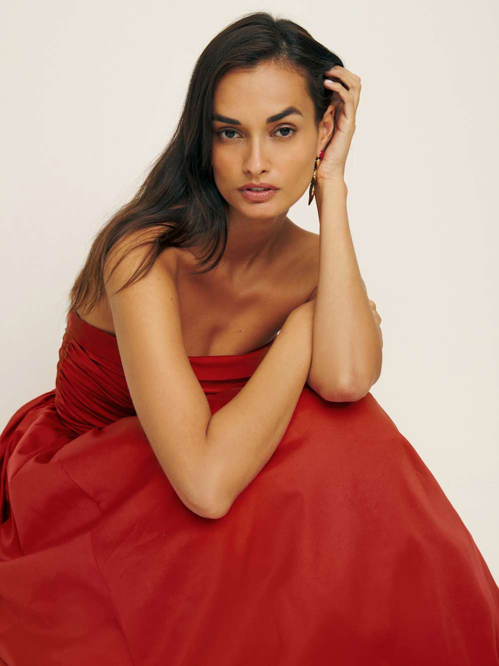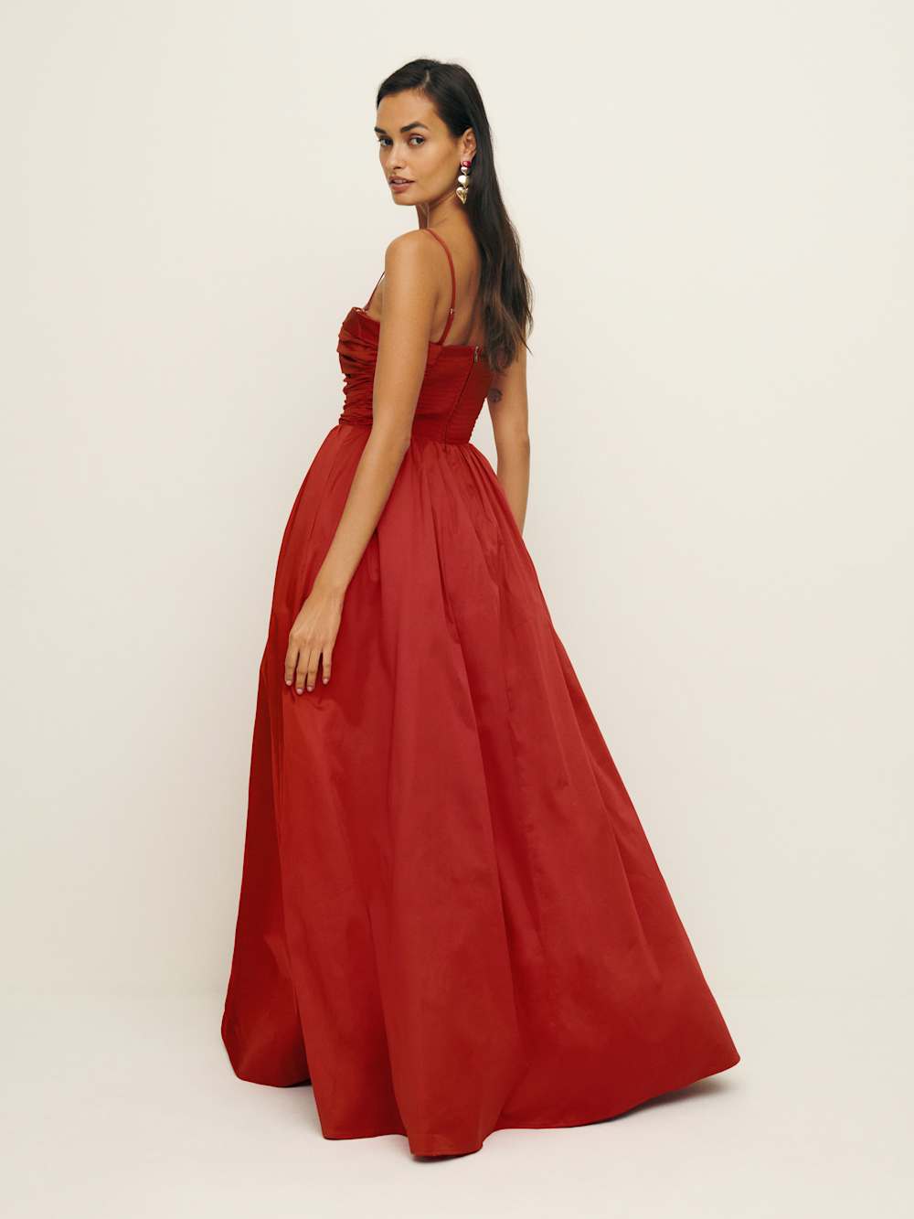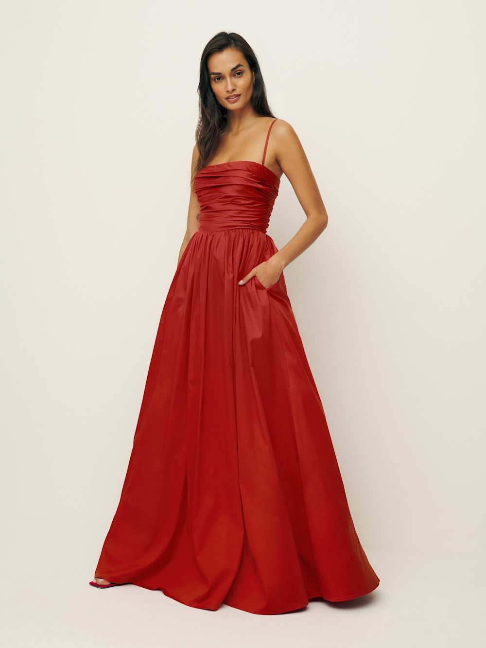 Weddings are in the air. Shop the Kastoria Dress from Reformation, a fitted maxi dress with a straight neckline, a-line skirt, and a pleated front.