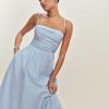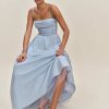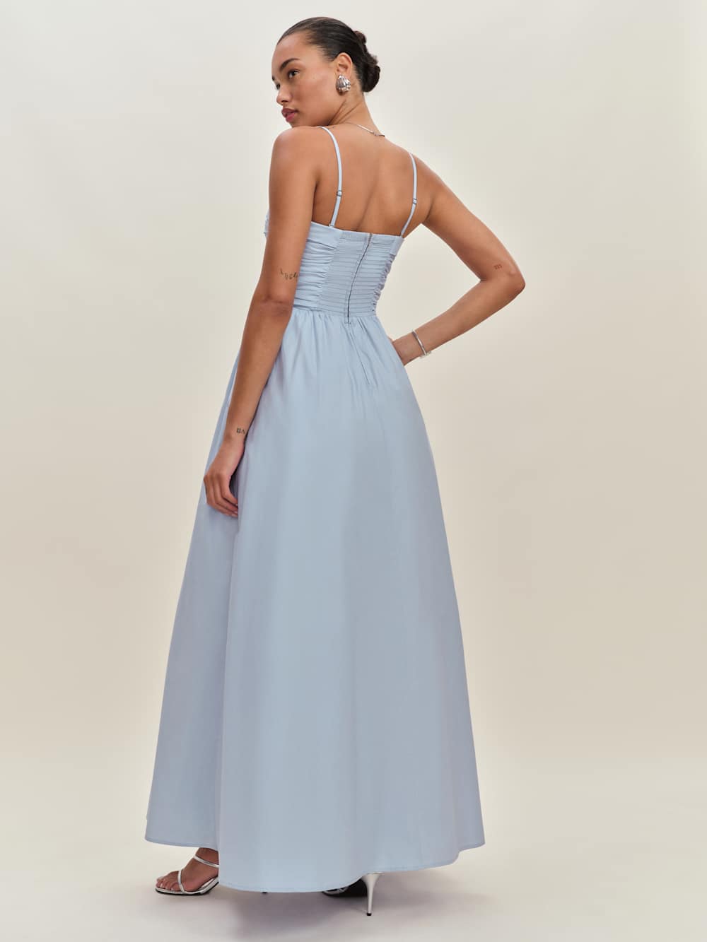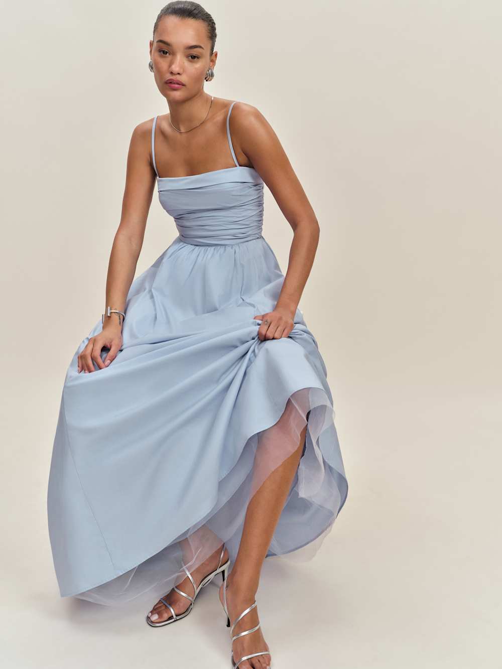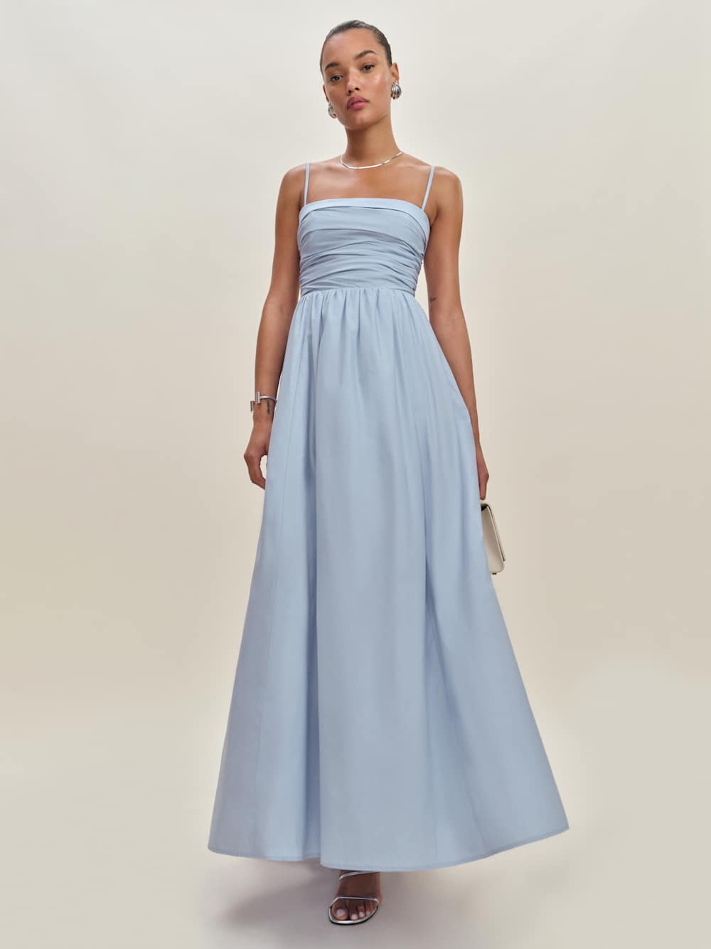 Weddings are in the air. Shop the Kastoria Dress from Reformation, a fitted maxi dress with a straight neckline, a-line skirt, and a pleated front.