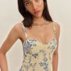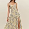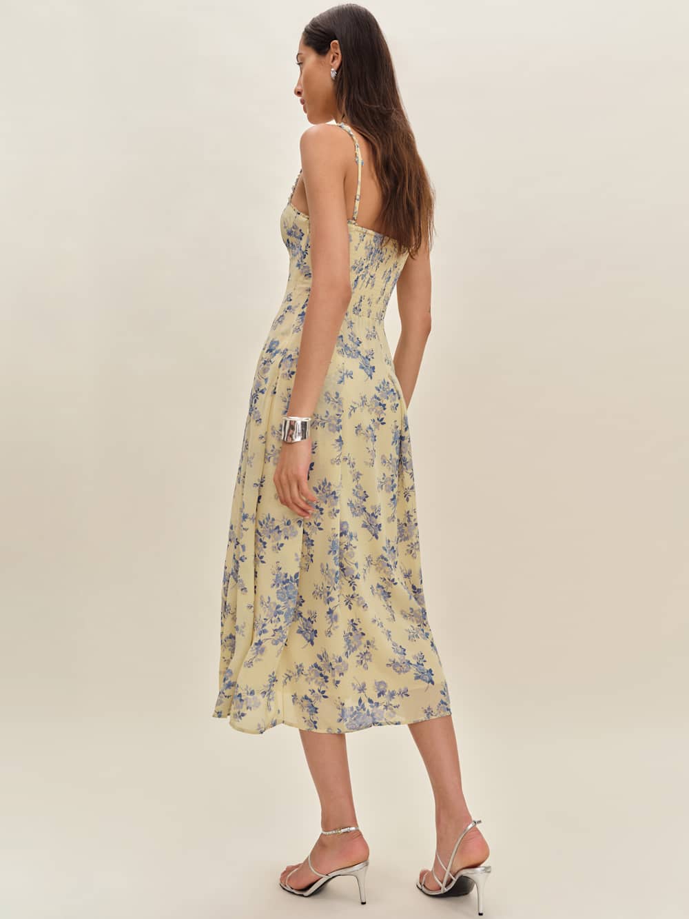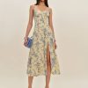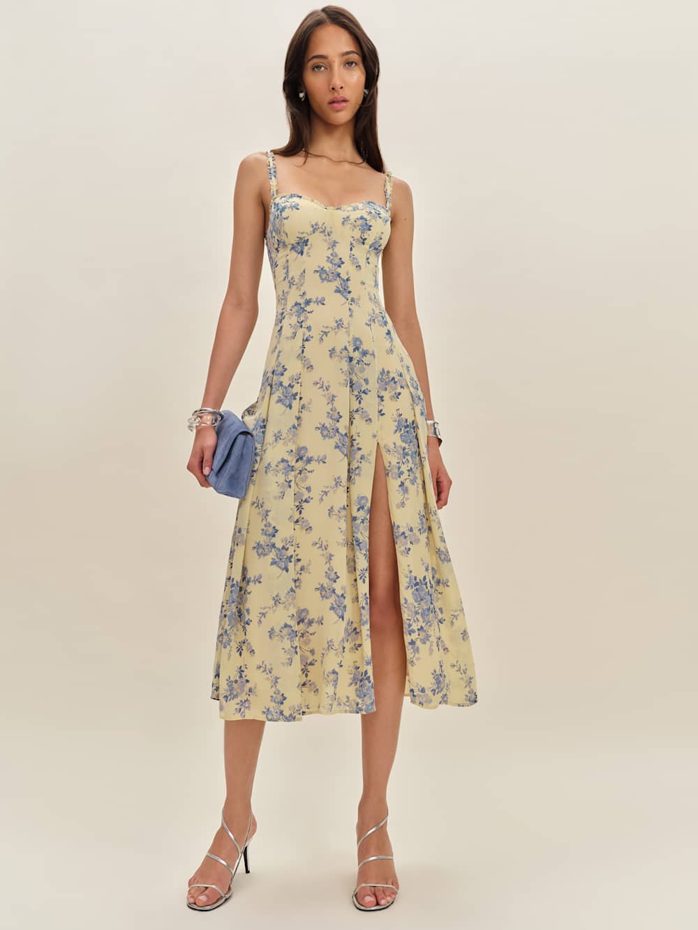 Romance for one. Shop the Katara Dress from Reformation, a sleeveless midi-length dress with a sweetheart neckline, ruffling at the straps, and a side slit.