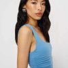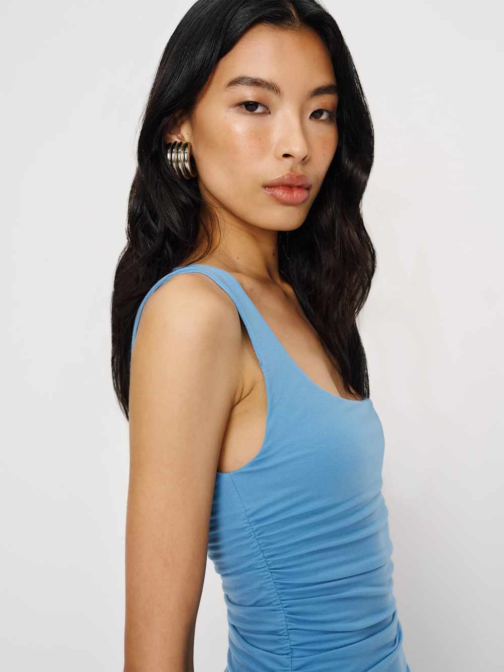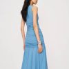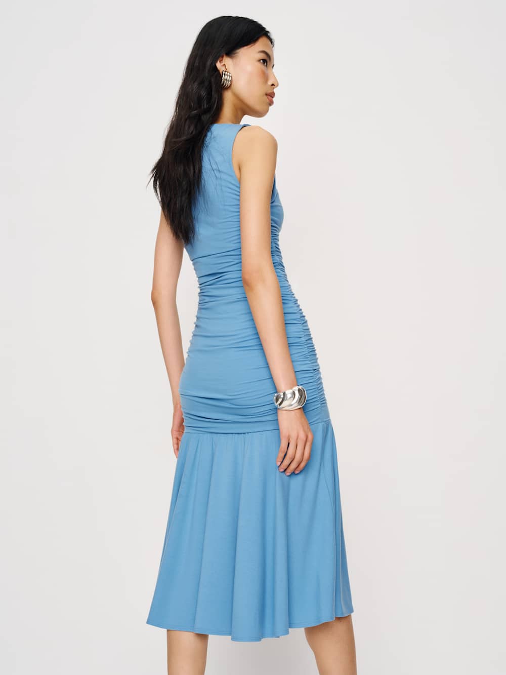 Shop the Kayla Knit Dress from Reformation, a sleeveless midi dress with a square neckline, drop waist, and ruching throughout.