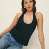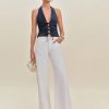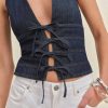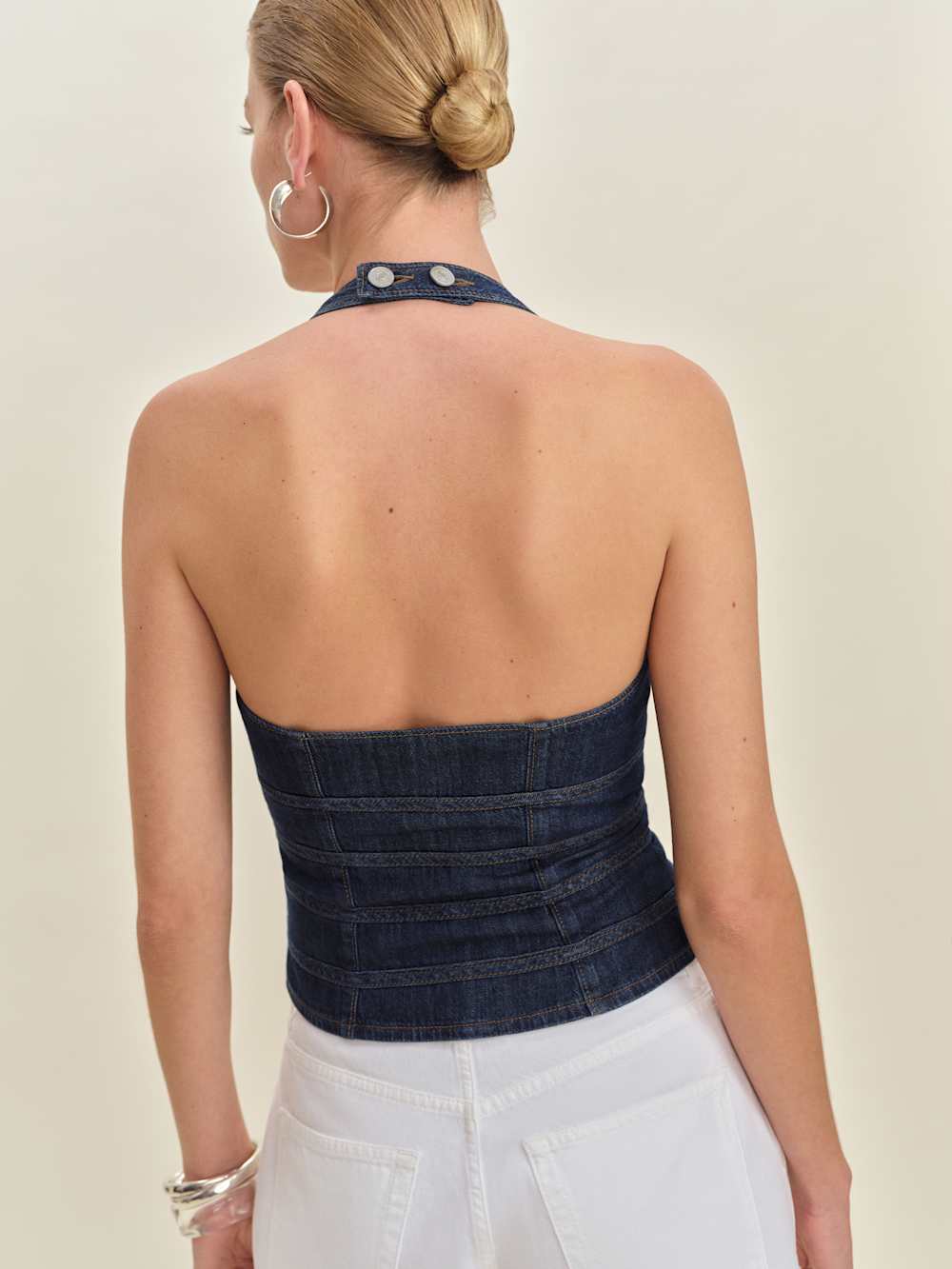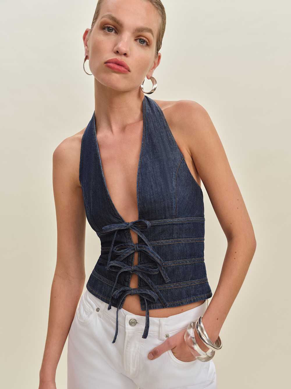 Up top. Shop the Kyleigh Denim Halter Top from Reformation, a sleeveless halter top with a deep v-neckline and bow detailing throughout the bodice.