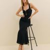 Wear the dress. Shop the Laine Dress from Reformation, a sleeveless midi dress with a sweetheart neckline, button detailing at the bust, and a mermaid fit.