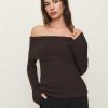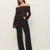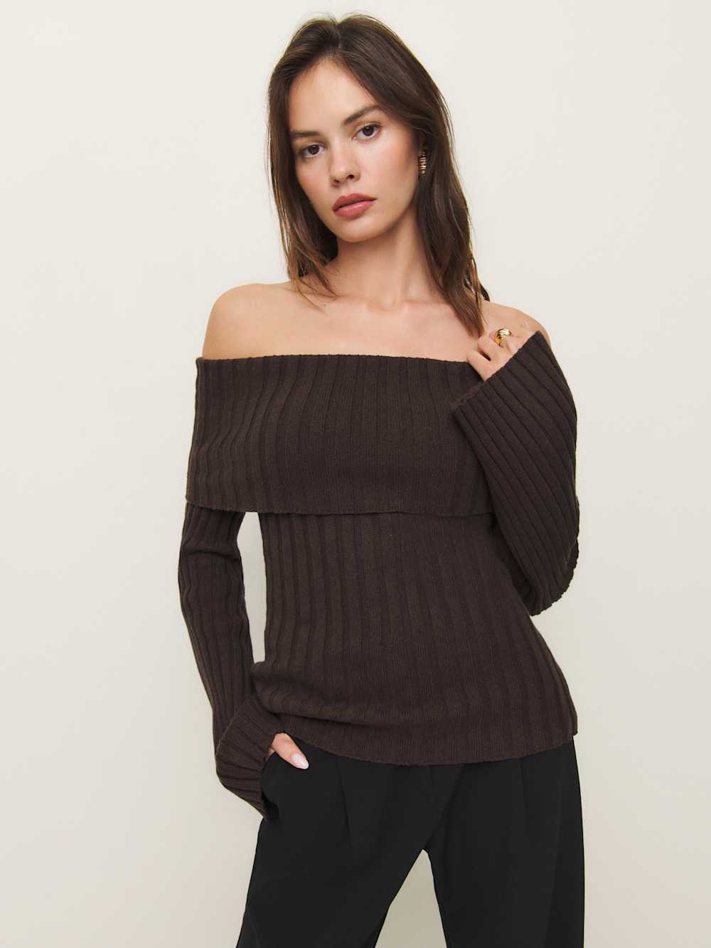 Cozy up. Shop the Lana Cashmere Blend Sweater from Reformation, an off-the-shoulder sweater with flared sleeves.