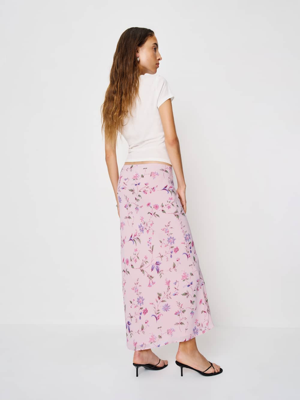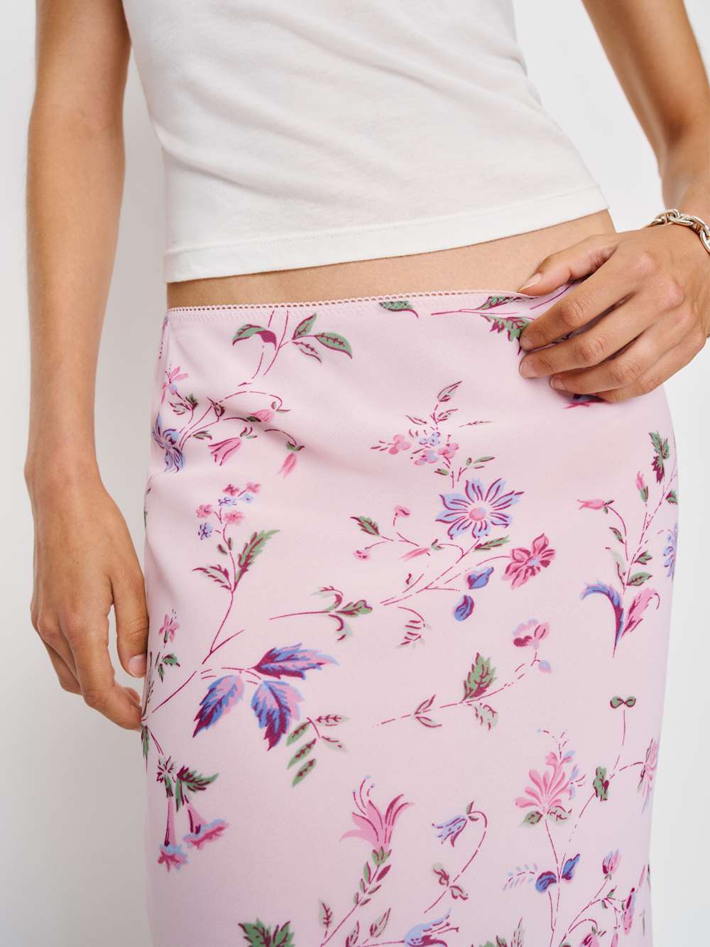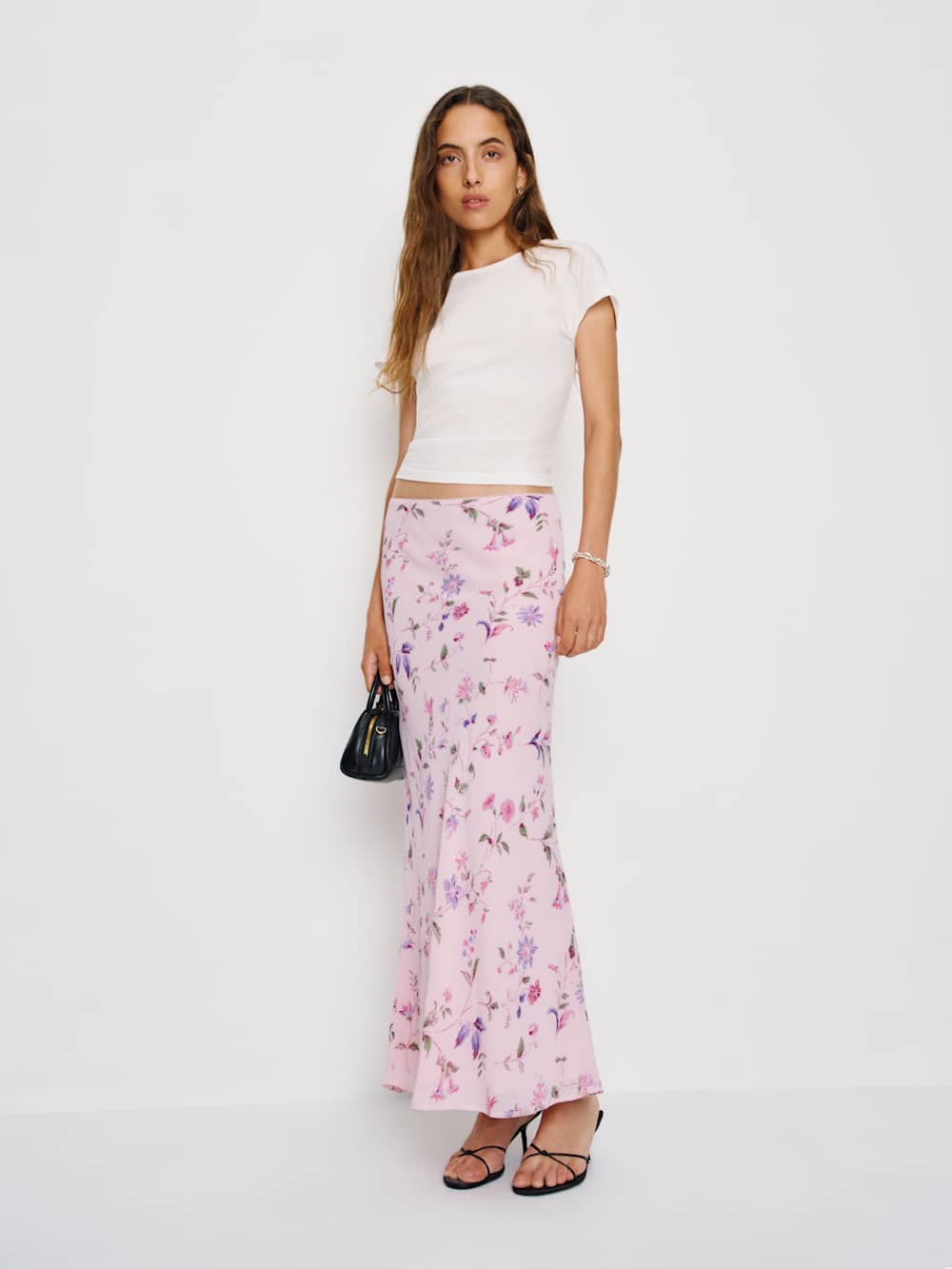 Let your skirt do the talking. Shop the Layla Silk Skirt from Reformation, a bias cut, midi skirt with an elasticated waist.