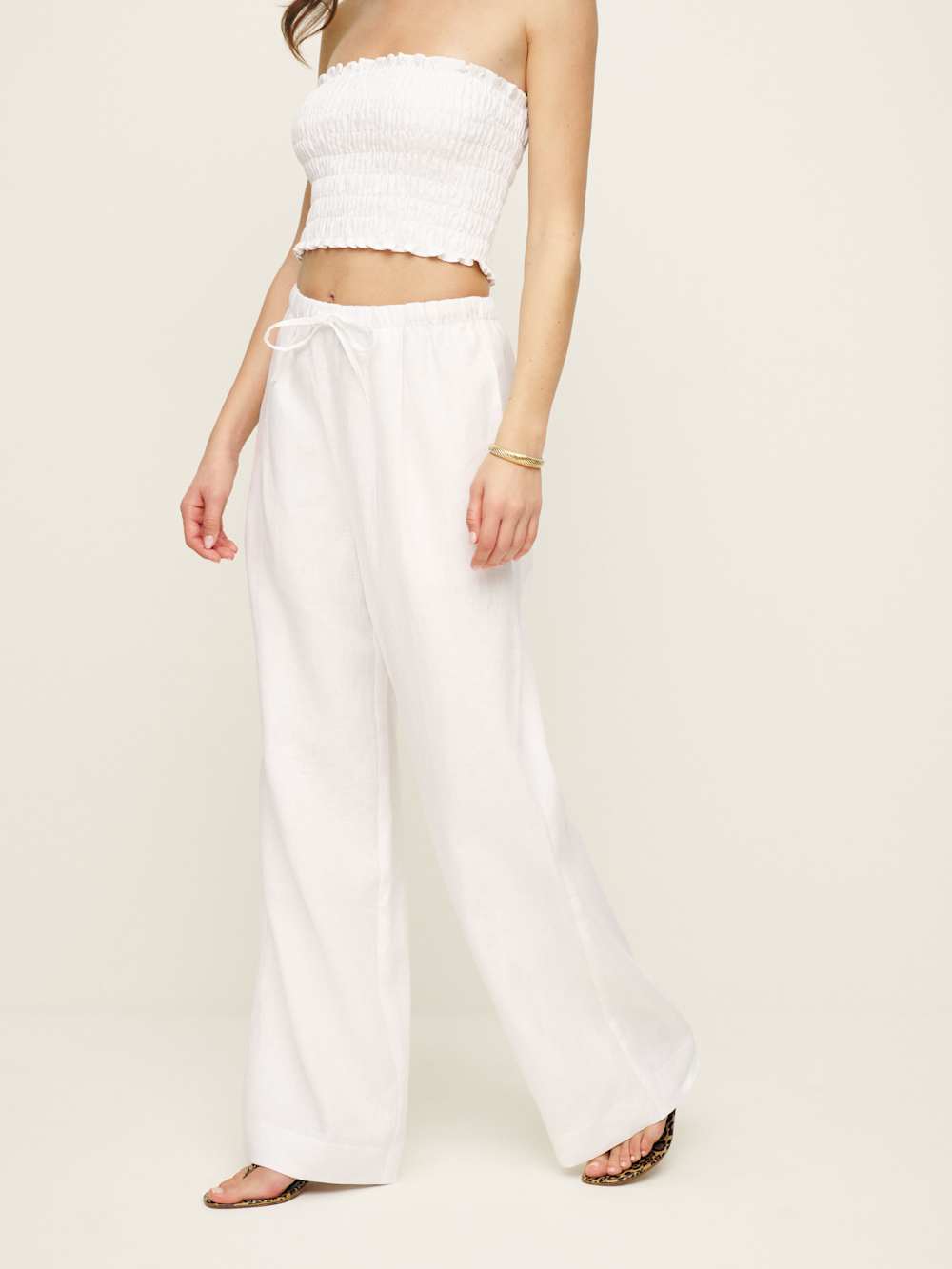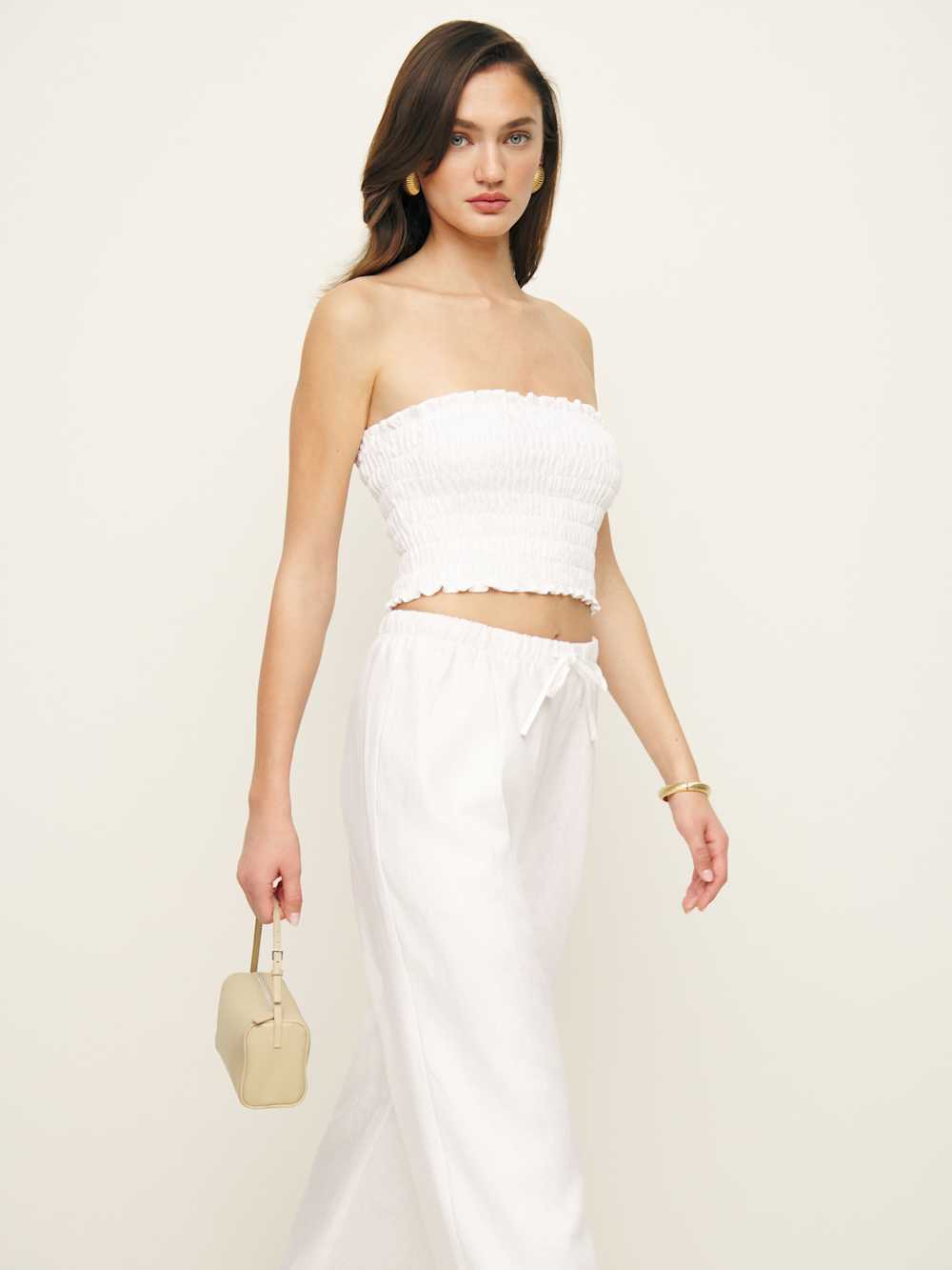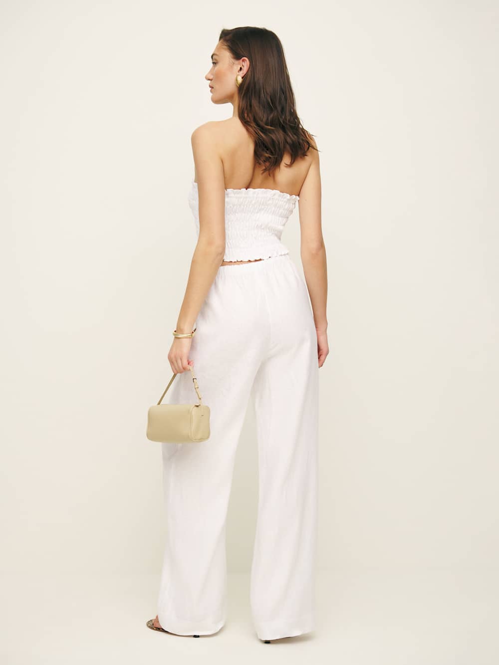 We make a great pair. Shop the Lena Linen Two Piece from Reformation, a two piece set with a strapless smocked top and relaxed fit pants.