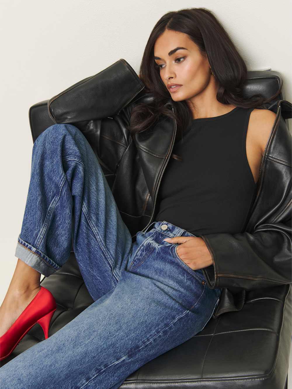Up top. Shop the Leni Knit Bodysuit from Reformation, a sleeveless knit bodysuit with a high scoop neckline.