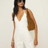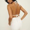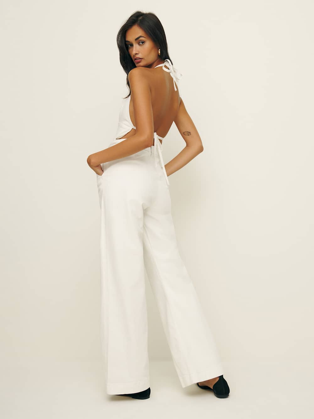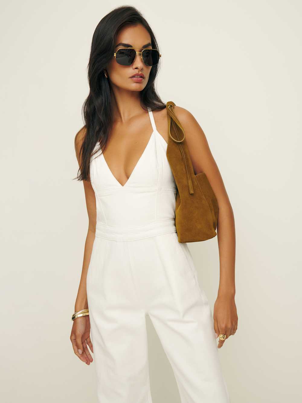 Happy, sustainable butts. Shop the Lennon Denim Jumpsuit from Reformation, a sleeveless jumpsuit with a deep v neck, wide leg, and ties on the neck and back.