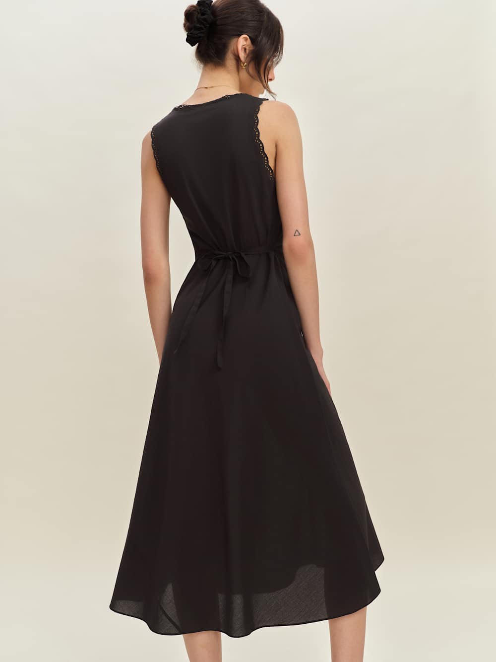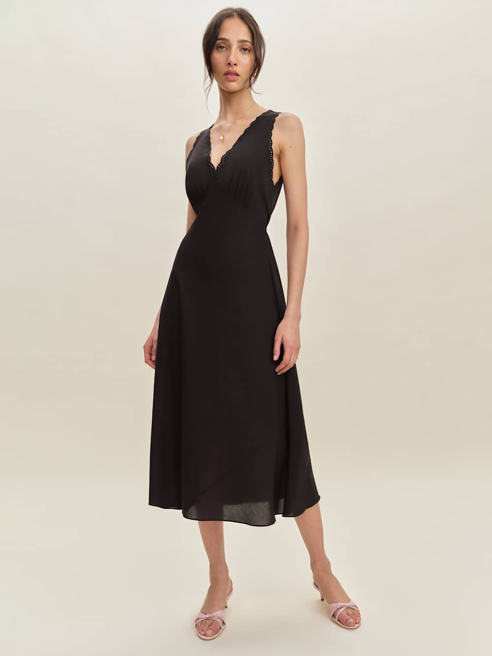 Sweet Dreams. Shop the Lila Sleep Dress from Reformation, a sleeveless midi dress with v neckline, embroidered trim, and an adjustable tie at the back.