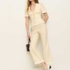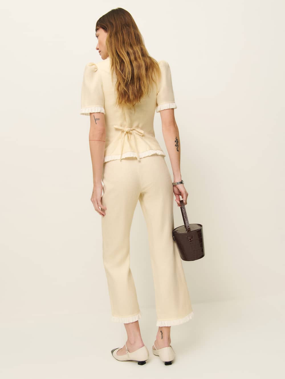 Better together. Shop the Lilibet Linen Two Piece from Reformation, a two-piece set with a short-sleeved top and matching pants with a ruffle trim.