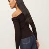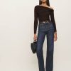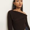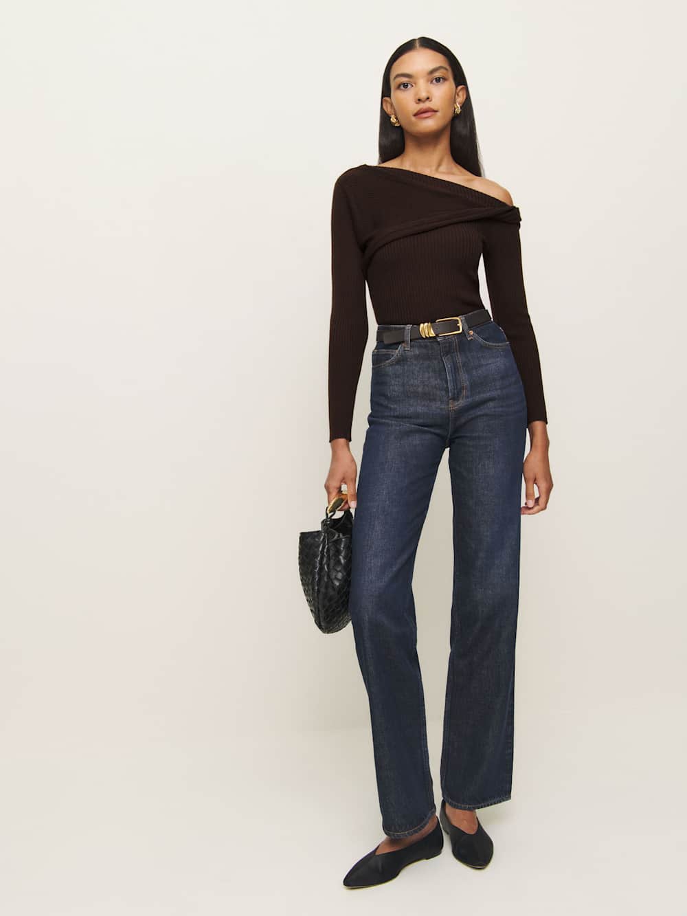 Cozy time. Shop the Lilou Regenerative Merino Sweater from Reformation, a long-sleeved sweater with an asymmetrical off-the-shoulder neckline.