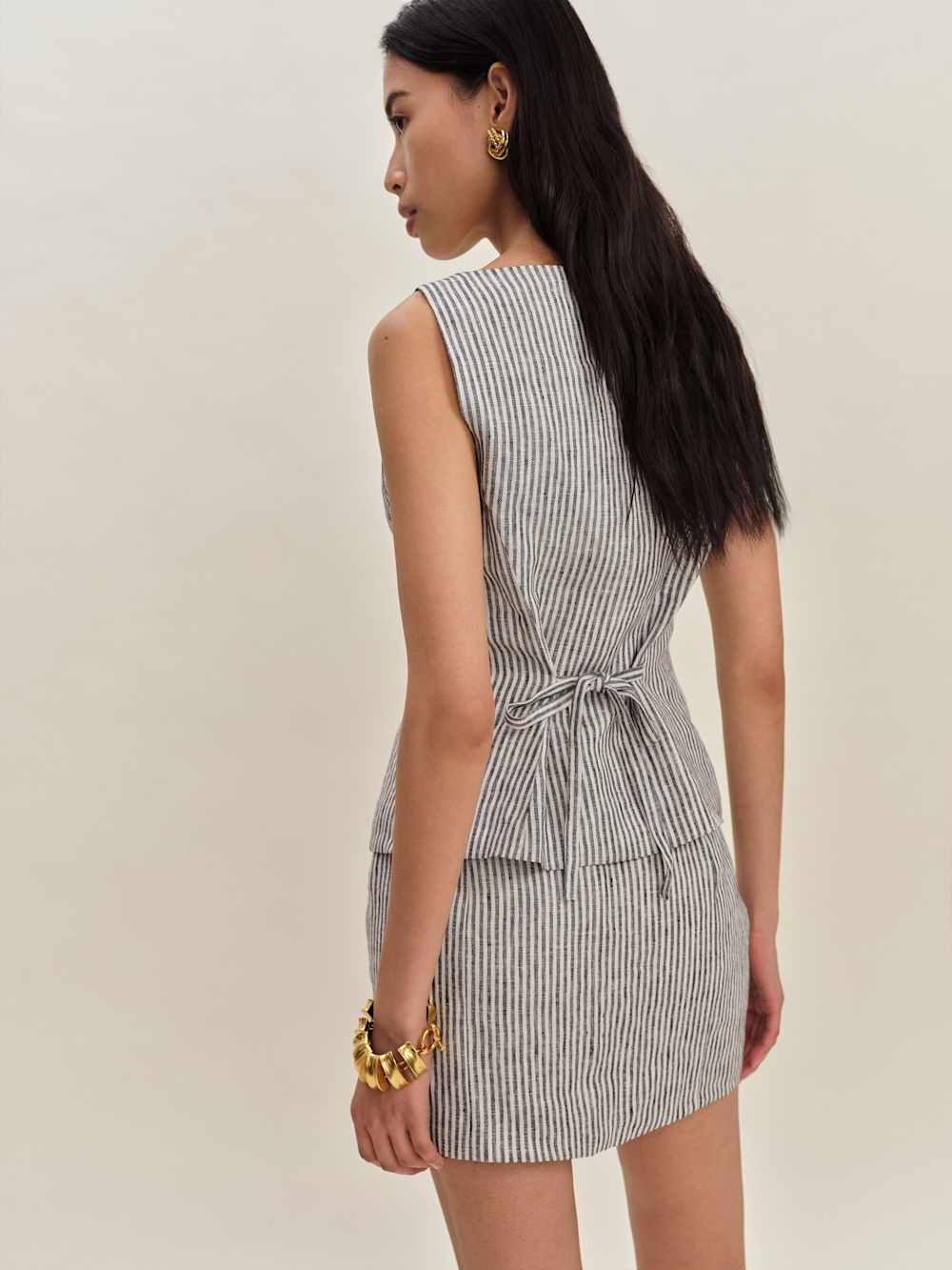 Who, me. Shop the Lina Linen Two Piece from Reformation, a two-piece set with a button-down top with an adjustable tie in the back and a mini skirt.