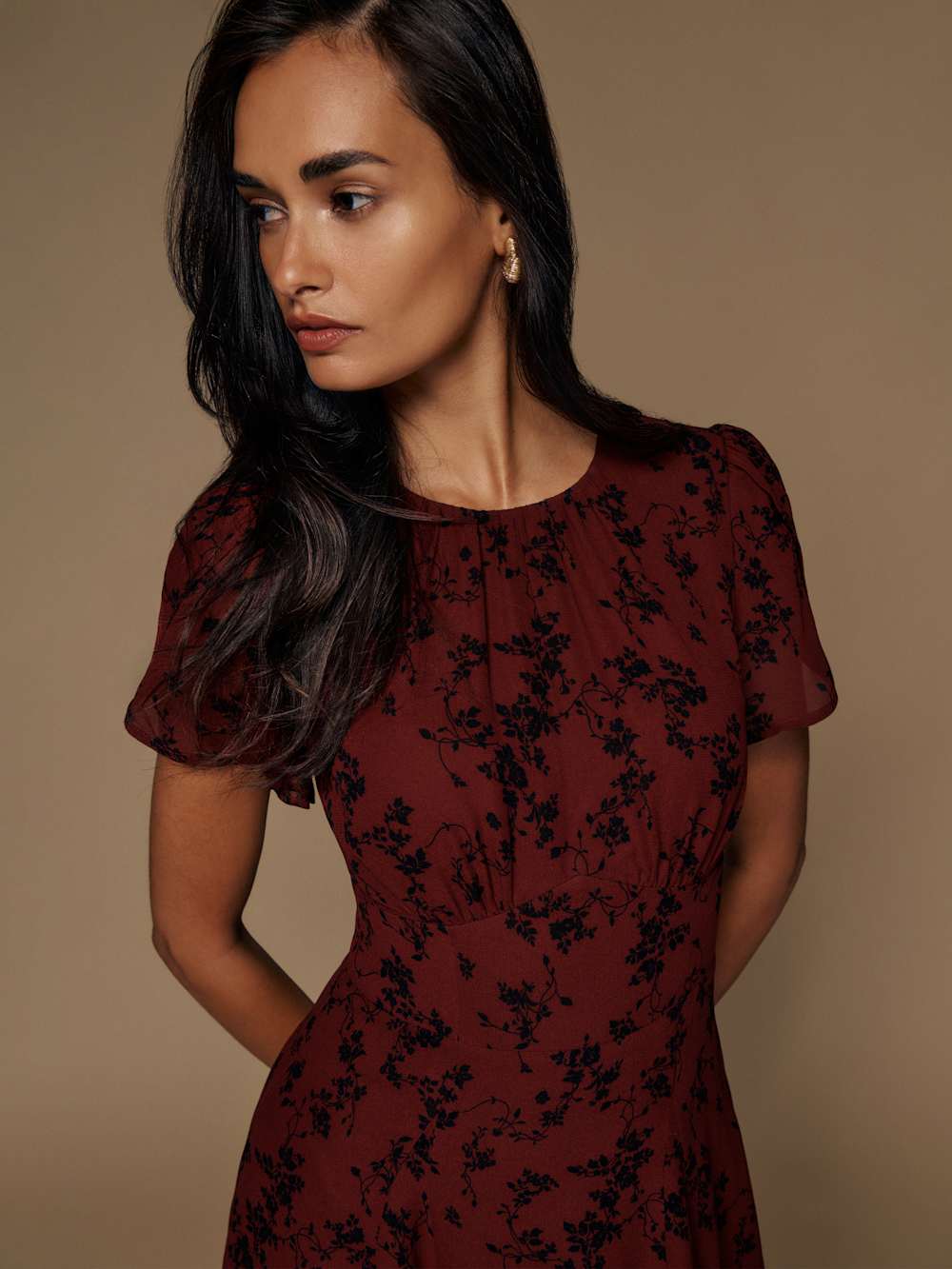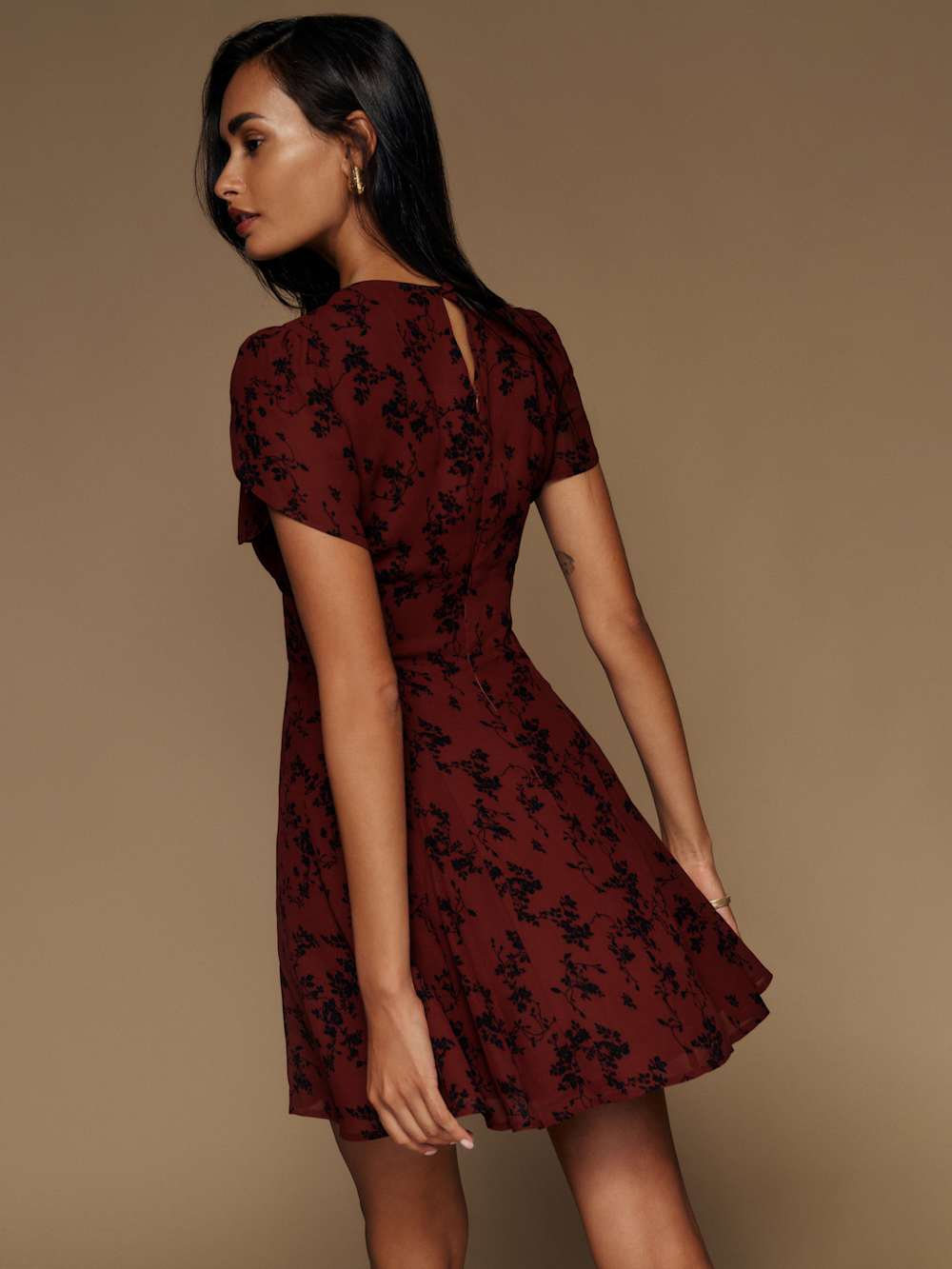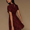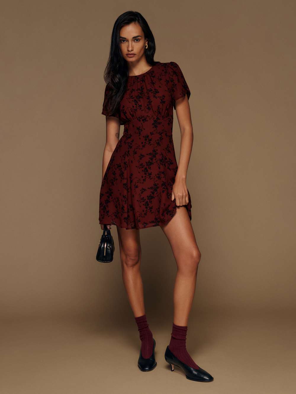 Who, me. Shop the Lula Dress from Reformation, is a mini length dress with a high neckline, short sleeves, and ruching at the bodice.