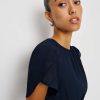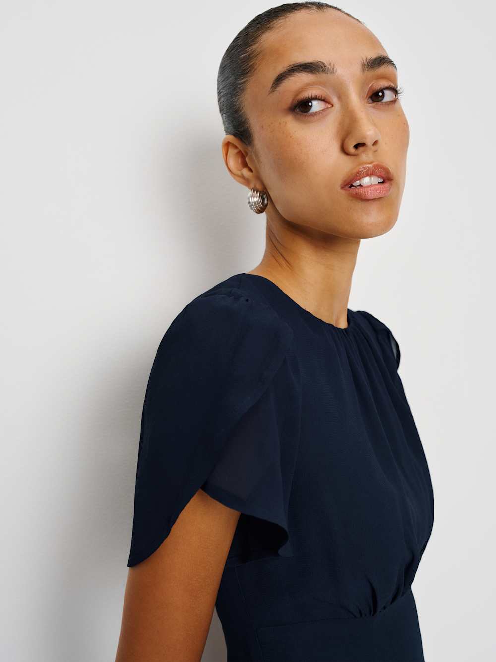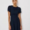 Who, me. Shop the Lula Dress from Reformation, is a mini length dress with a high neckline, short sleeves, and ruching at the bodice.