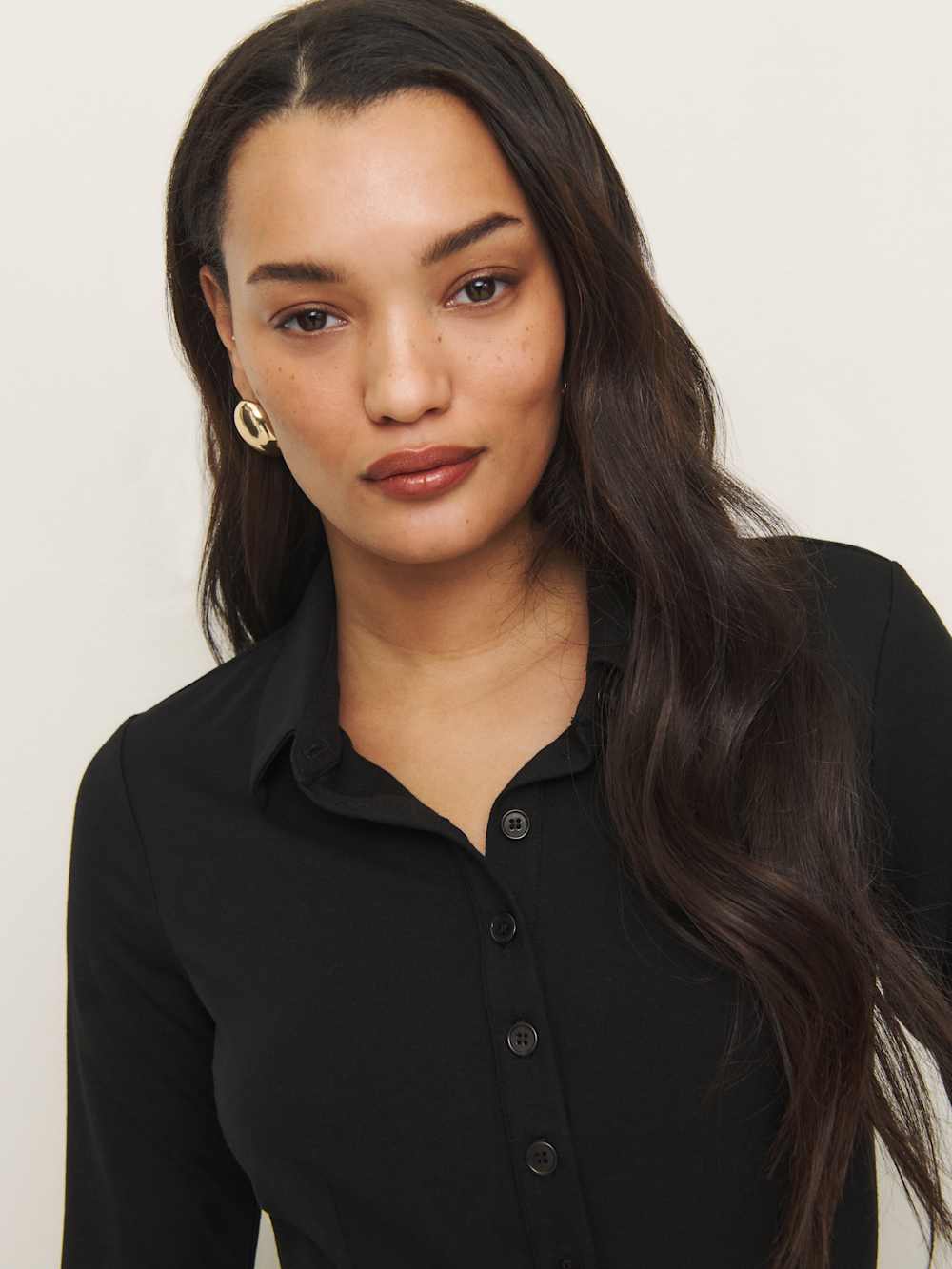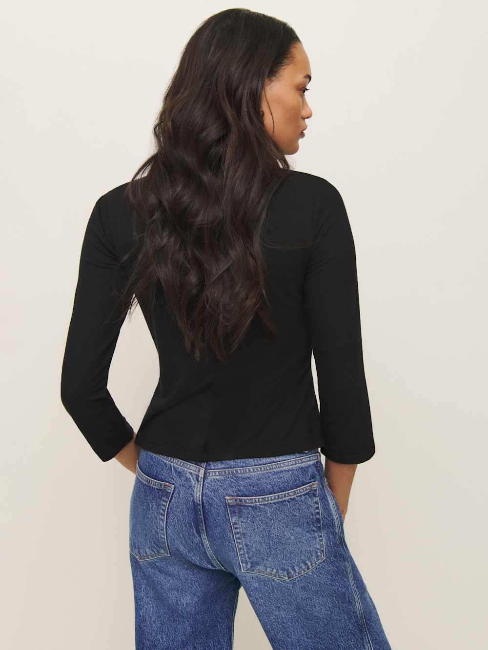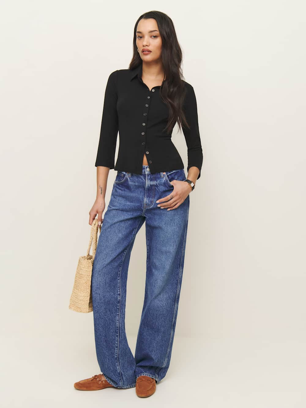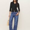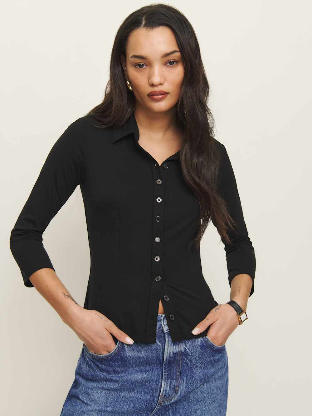 Layer up. Shop the Margaret Knit Top from Reformation, a cardigan with 3/4 length sleeves, a collared neckline, and a button front.
