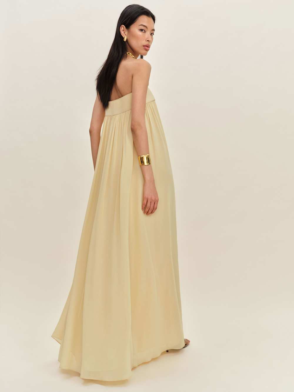 Get some compliments. Shop the Maribelle Dress from Reformation, a strapless full length dress with a square neckline and pleating throughout.