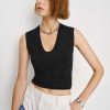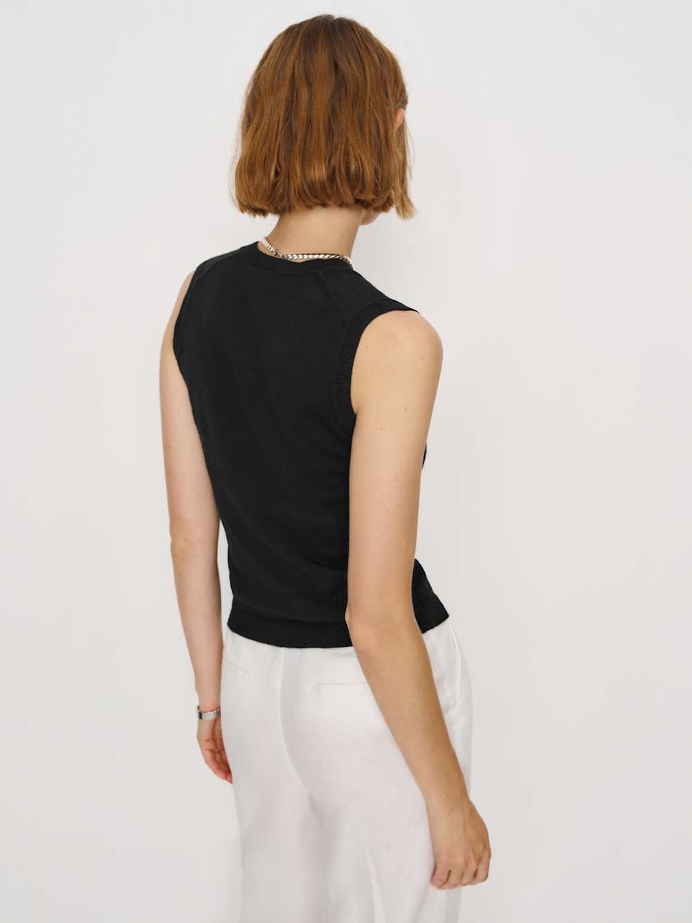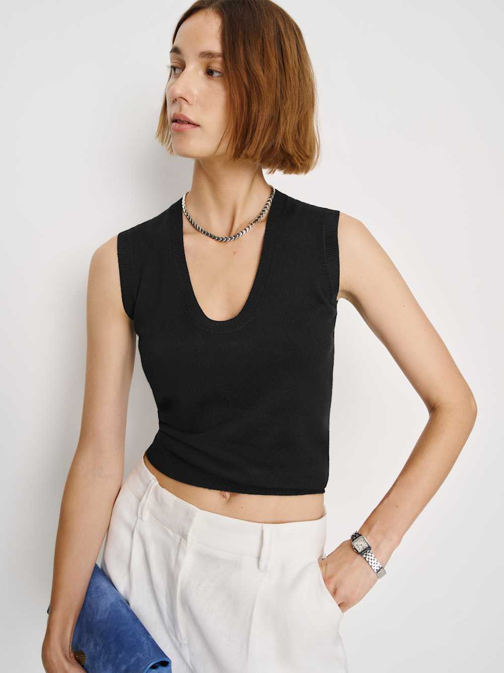 Up top. Shop the Marta Regenerative Merino Sweater Tank from Reformation, a sleeveless sweater tank with a deep U-shaped neckline and thick shoulder straps.