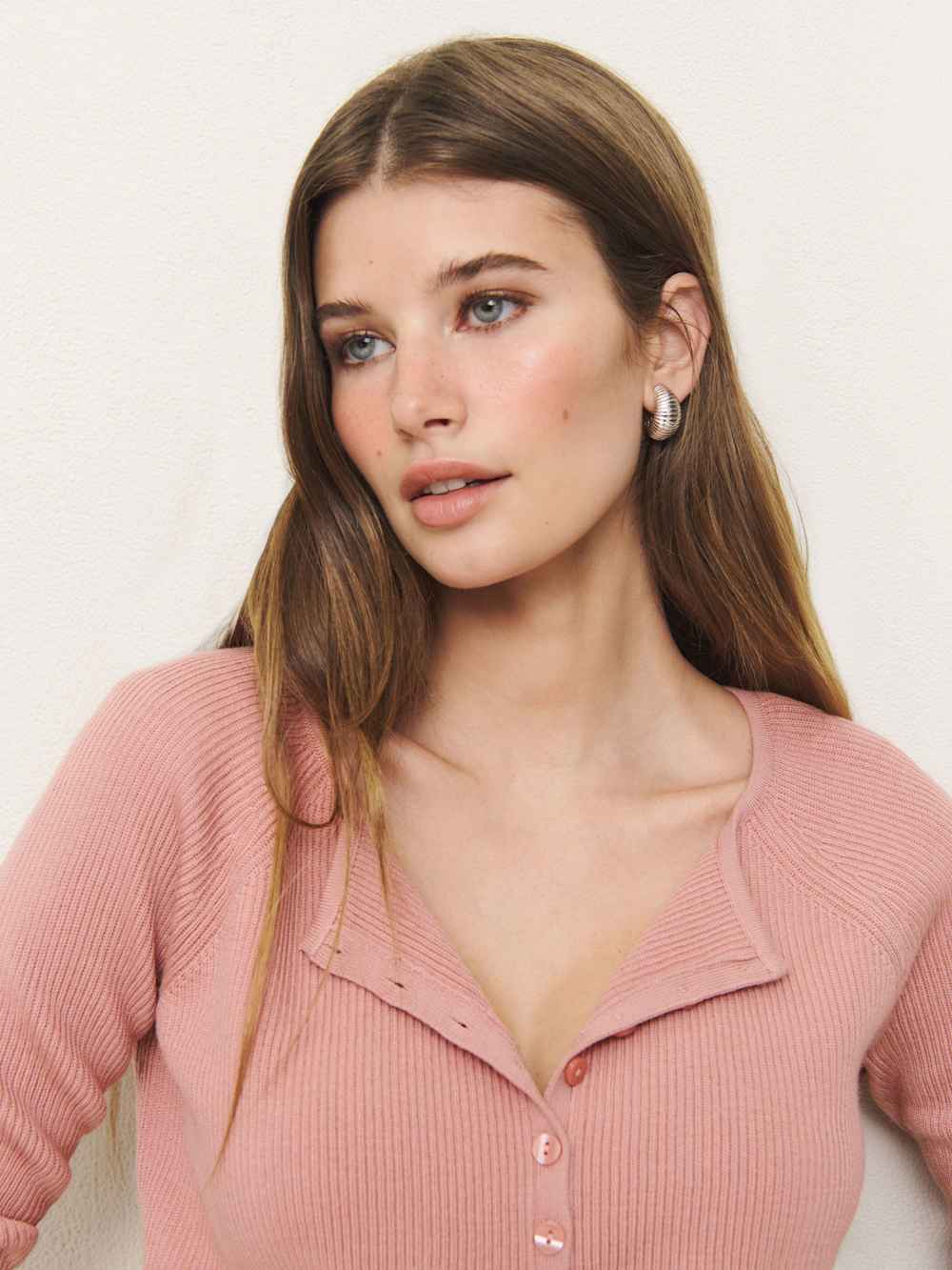 Layer up. Shop the Meadow Regenerative Merino Cardigan from Reformation, a collarless cardigan with a button front and ribbing throughout.