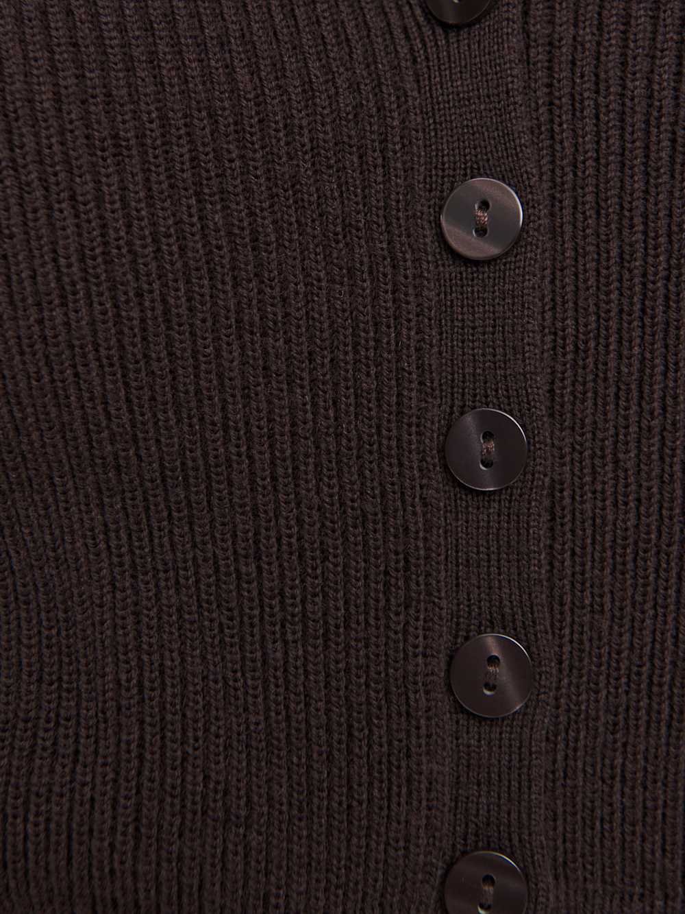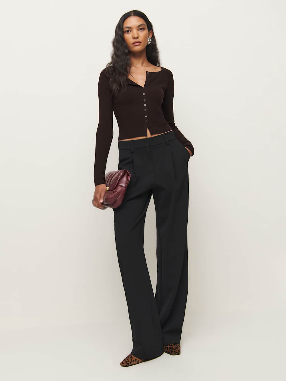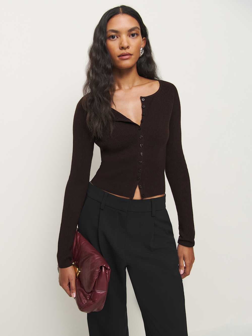 Layer up. Shop the Meadow Regenerative Merino Cardigan from Reformation, a collarless cardigan with a button front and ribbing throughout.