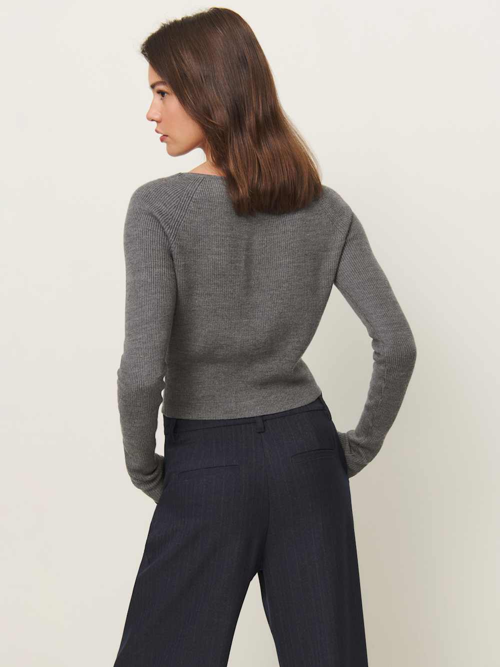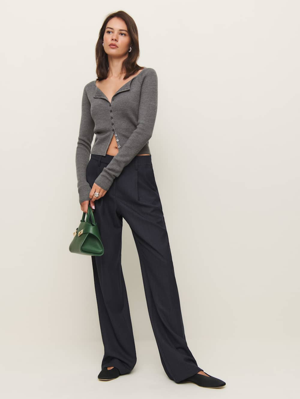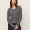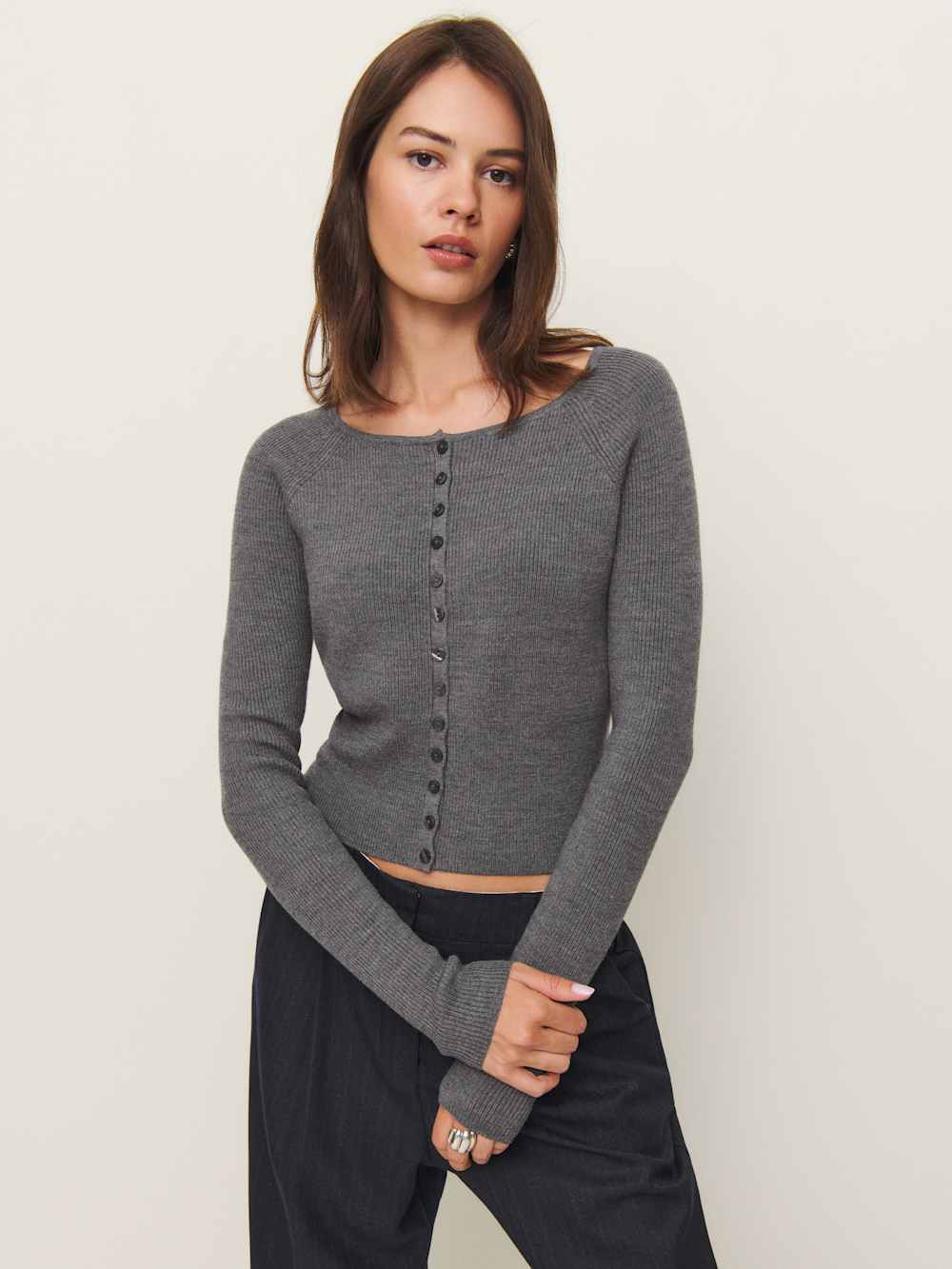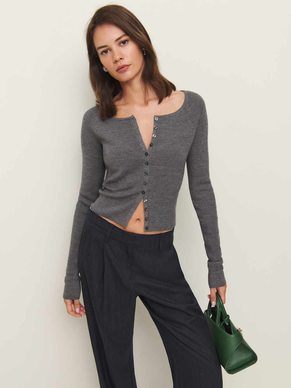 Layer up. Shop the Meadow Regenerative Merino Cardigan from Reformation, a collarless cardigan with a button front and ribbing throughout.