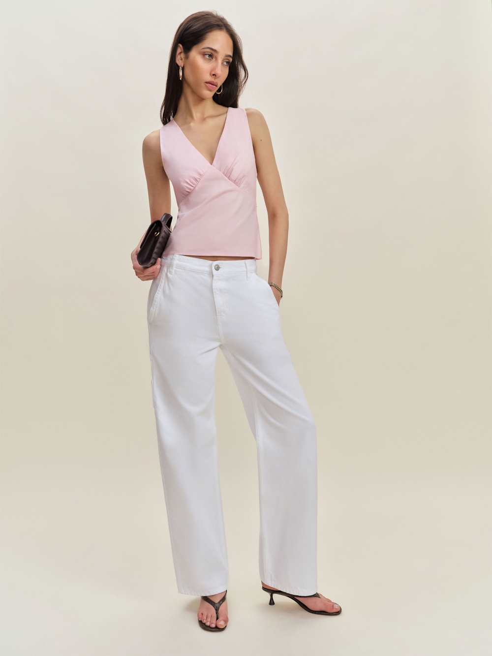 Up top. Shop the Meg Top from Reformation, a sleeveless top with a v-neckline, bust cust seams, and ruching at the bust.