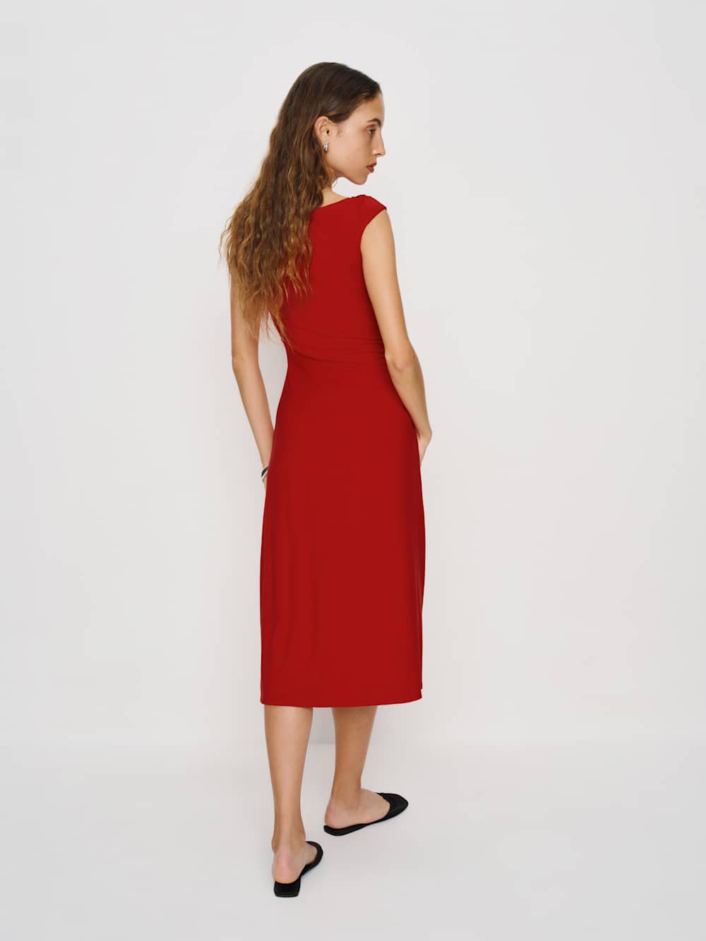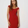 How classic. Shop the Milo Knit Dress from Reformation, an off-the-shoulder midi dress with ruching at the neckline and an adjustable tie.