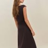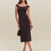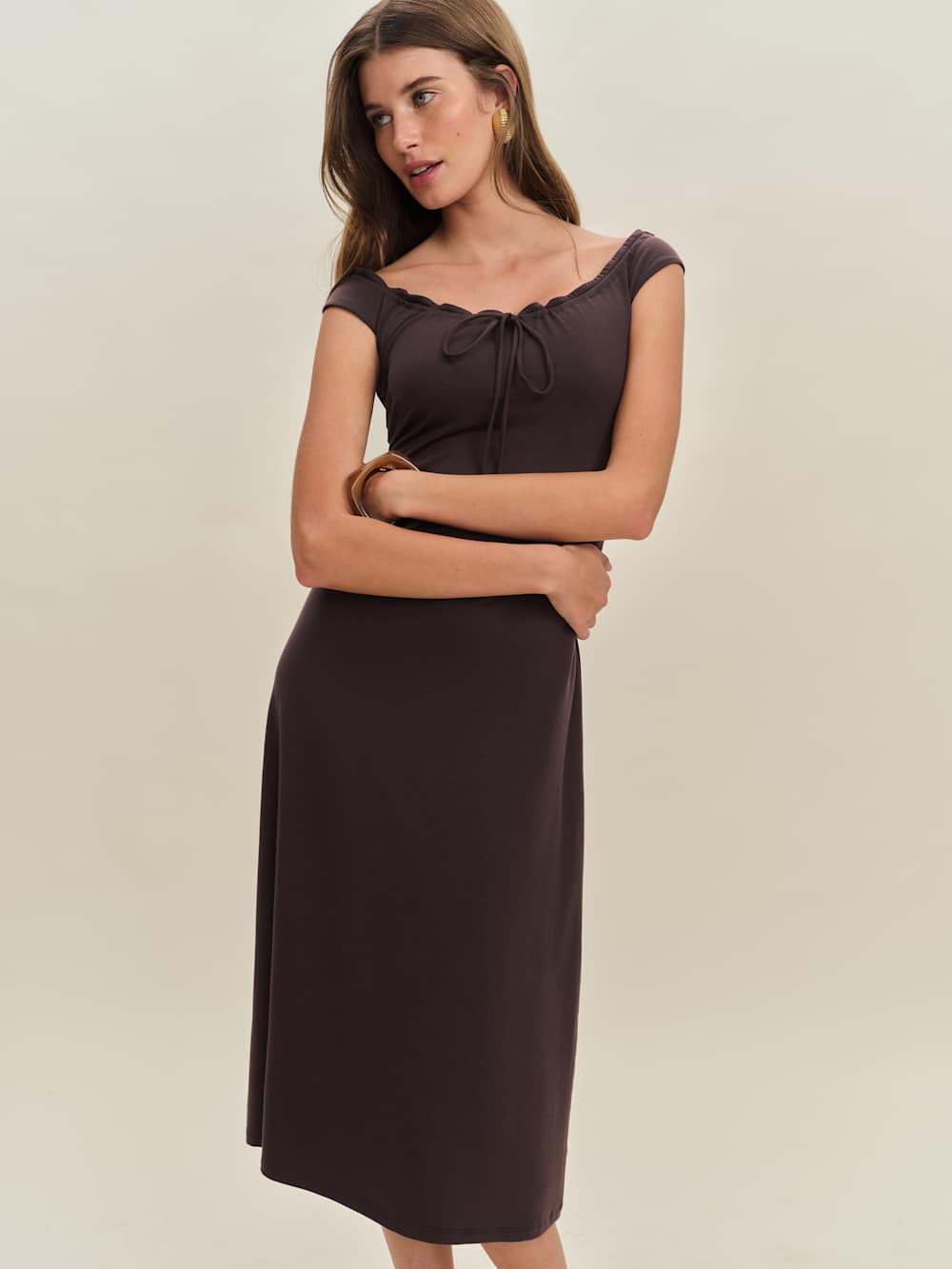 How classic. Shop the Milo Knit Dress from Reformation, an off-the-shoulder midi dress with ruching at the neckline and an adjustable tie.