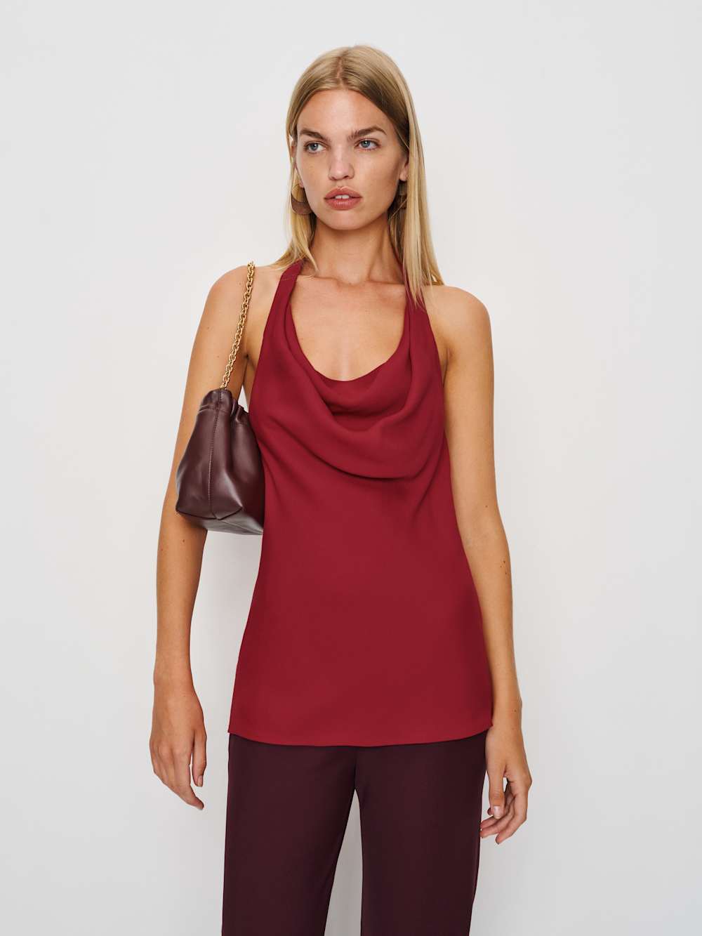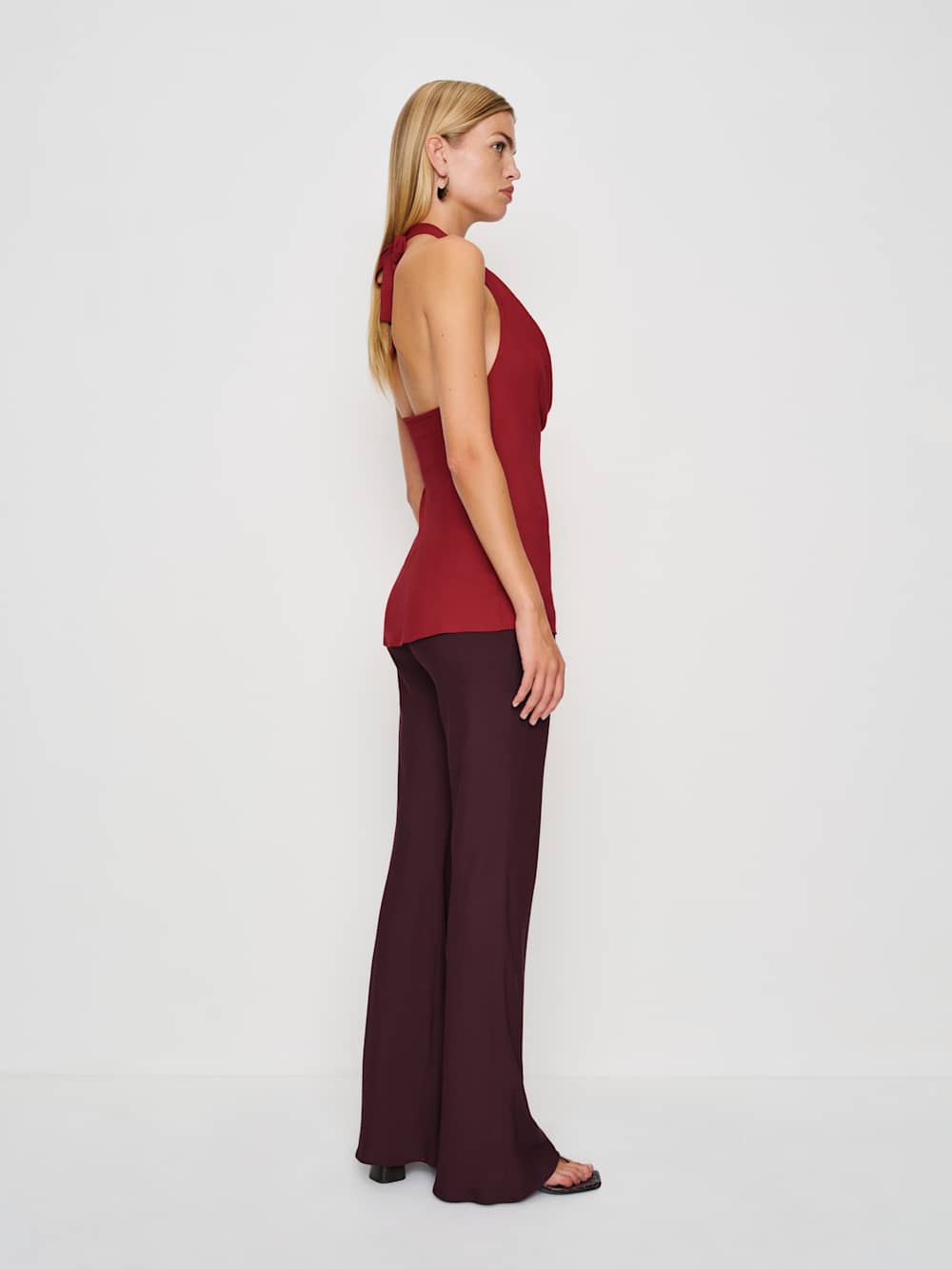 What do we have here? Shop the Mina Two Piece from Reformation, a sleeveless top with a cowl neckline and partial open back with a matching mid-rise pant.