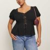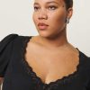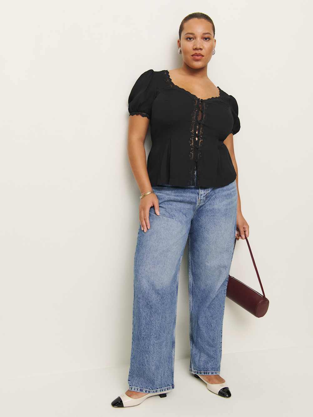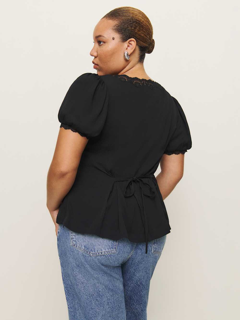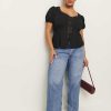 Up top. Shop the Minette Top ES from Reformation, a fitted top with a V-neckline, button front, short puffed sleeves, and lace detailing.