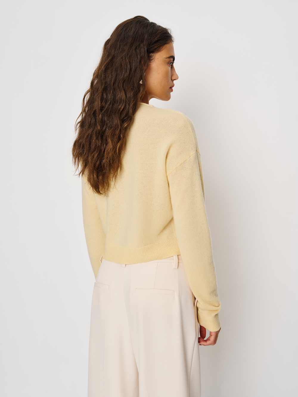This is a fine-gauge recycled cashmere blend sweater knit – 95% Recycled Cashmere, 5% Cashmere. Hand wash + dry flat.