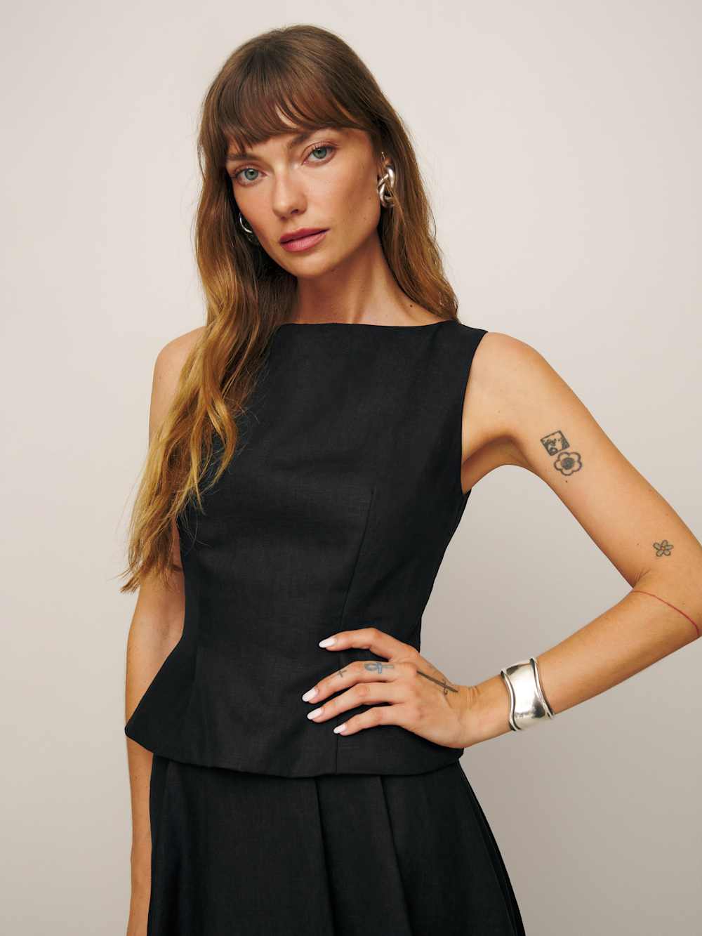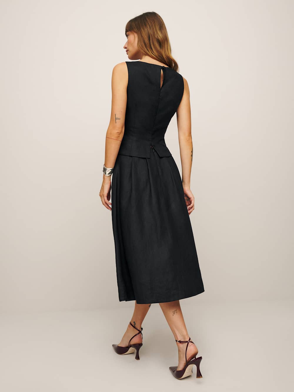No nonsense. Shop the Moya Linen Two Piece from Reformation, a sleeveless top with a high neckline and matching midi skirt.