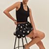 The model is wearing a size 0 and is 5’10", 25" waist, 34.5" hips, 31" bust.
