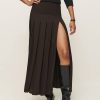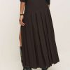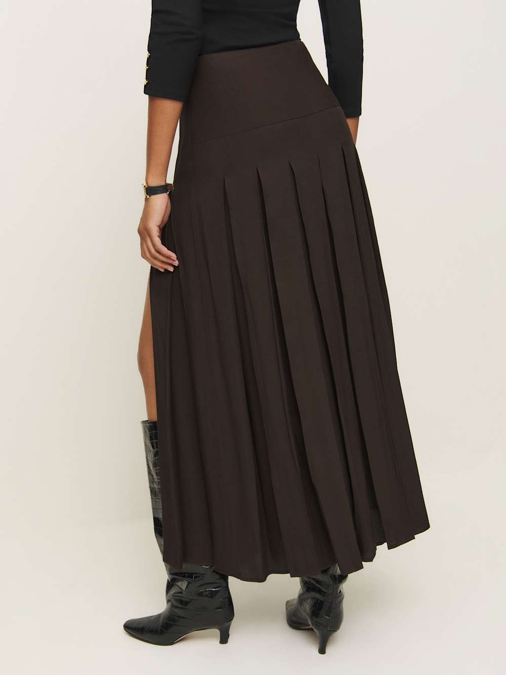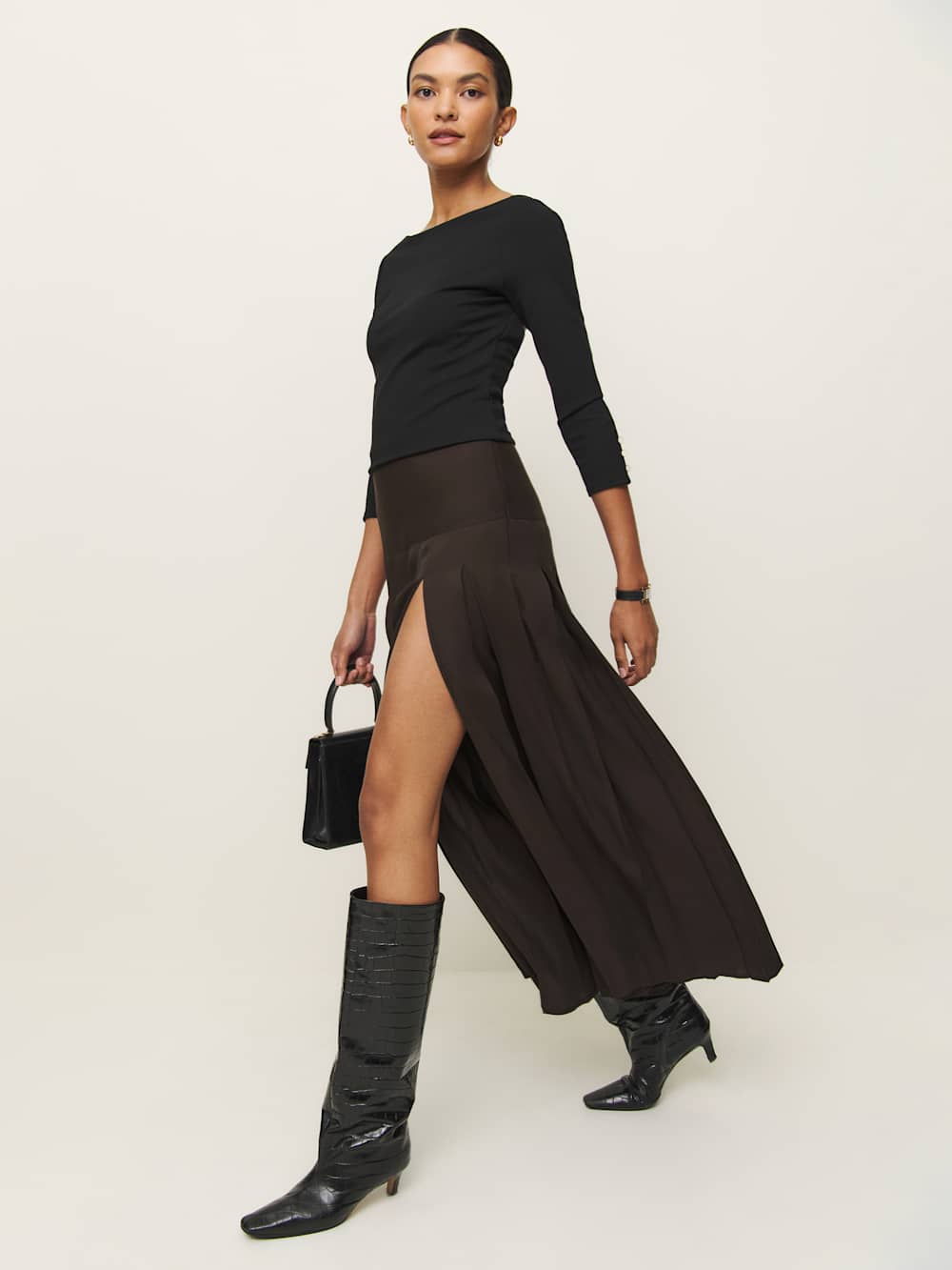 Wear the skirt. Shop the Nancy Skirt from Reformation, a mid-rise maxi skirt with a drop waist, high side slit, and pleating throughout.