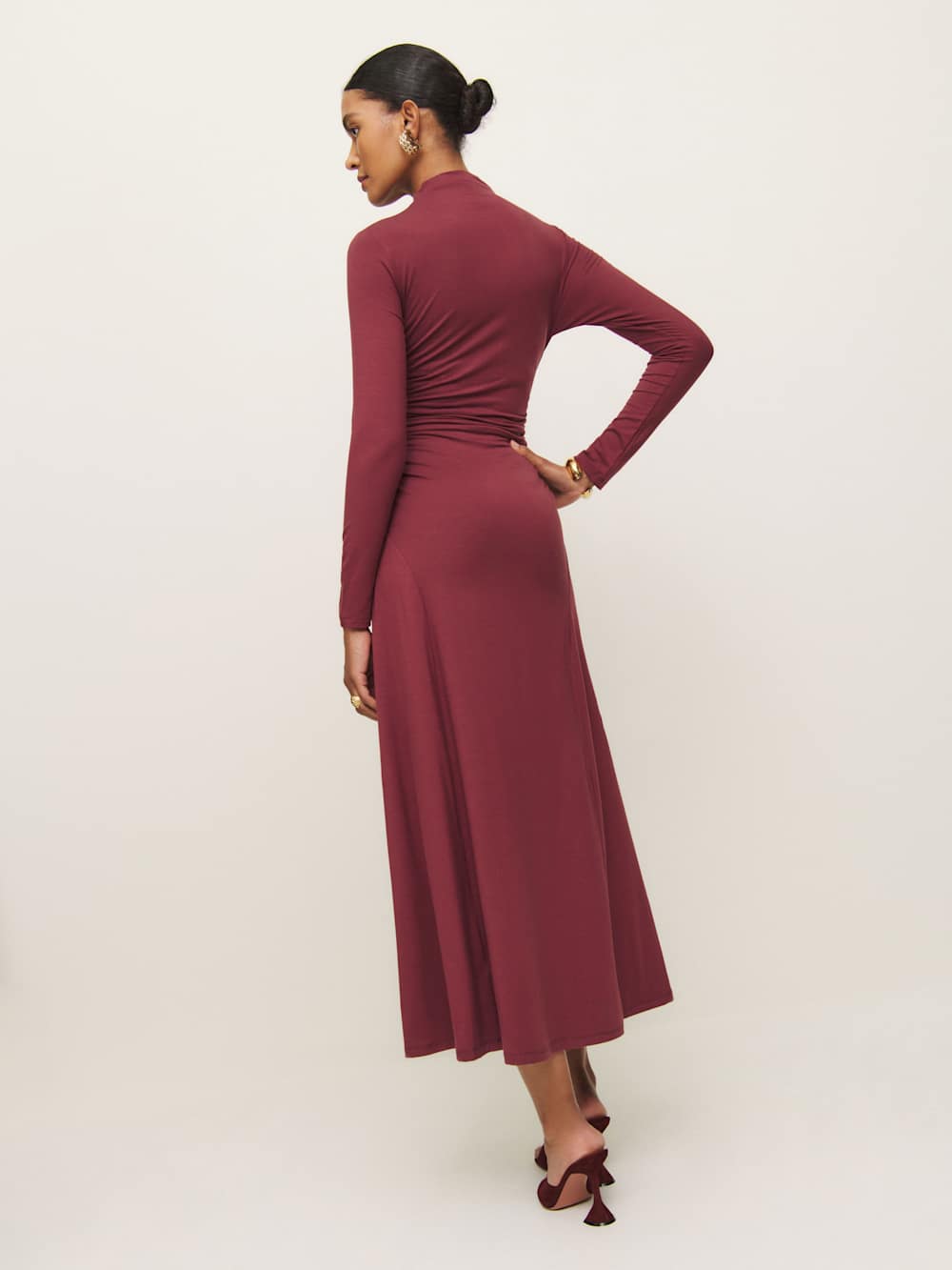 Get some compliments. Shop the Nemy Knit Dress from Reformation, a long sleeve maxi dress with a mock neckline and ruching through the bodice.