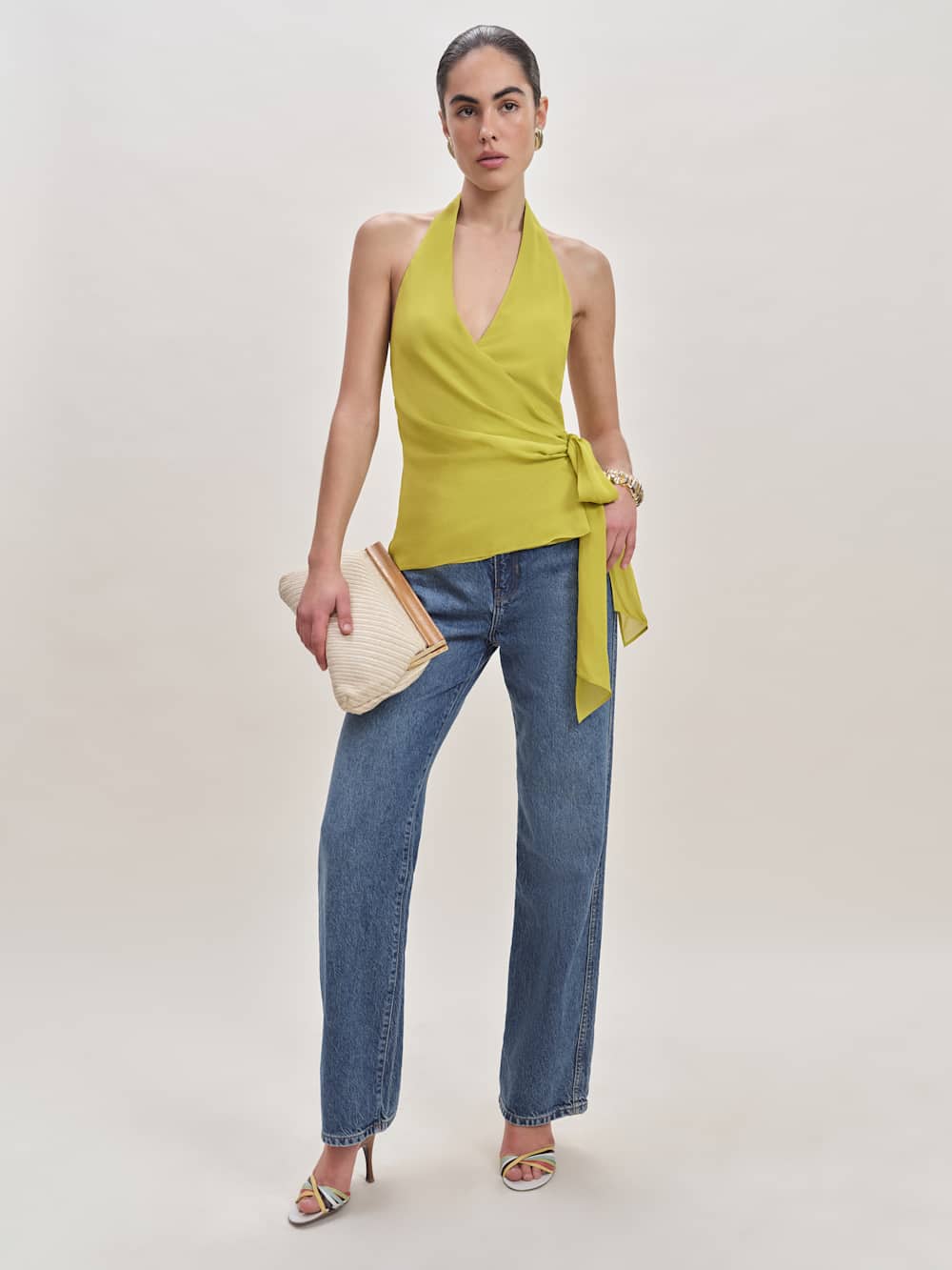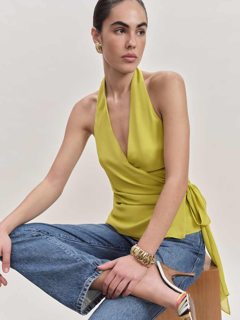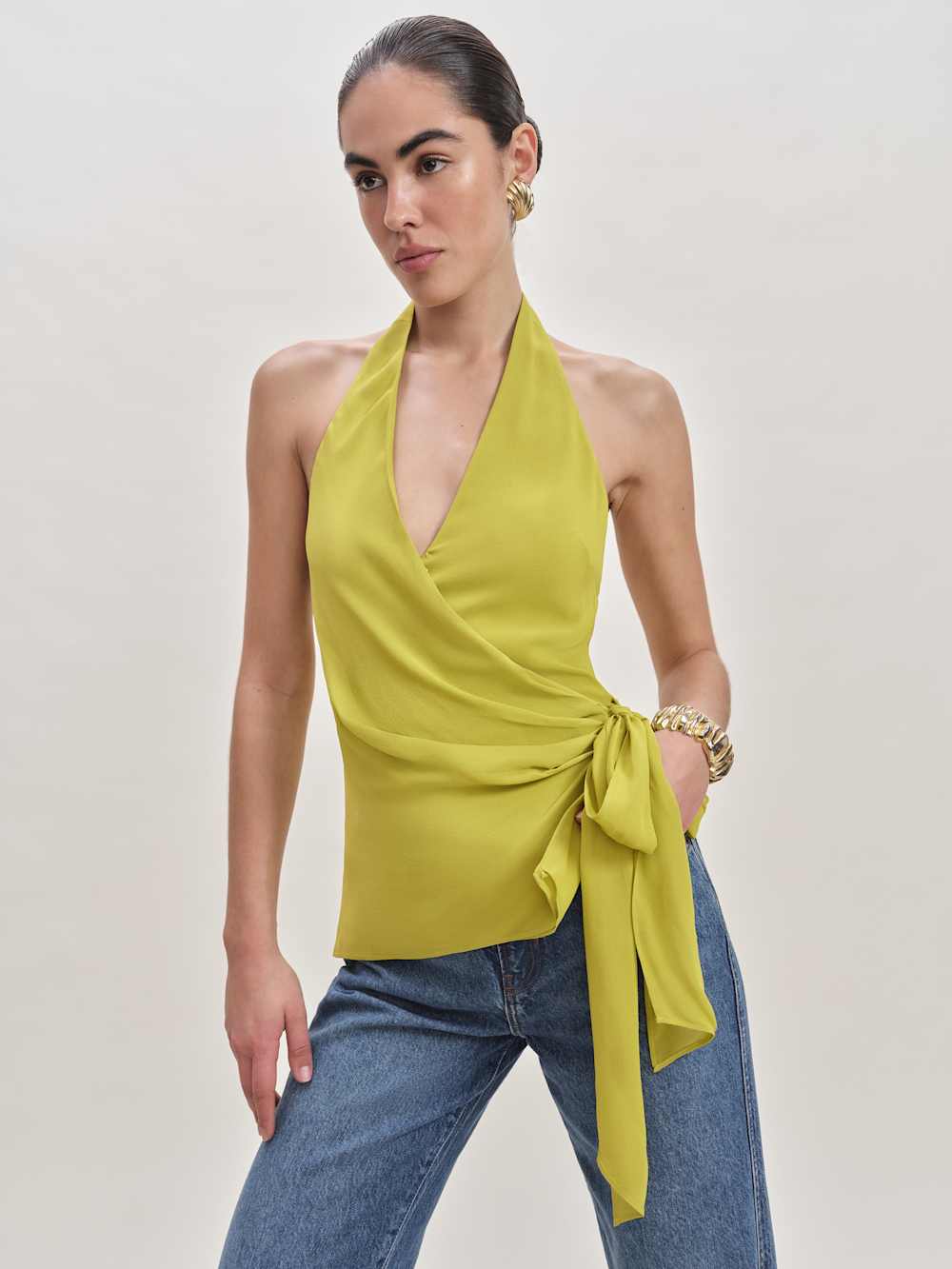Up top. Shop the Nila Top from Reformation, a sleeveless wrap top with a halter neckline.