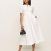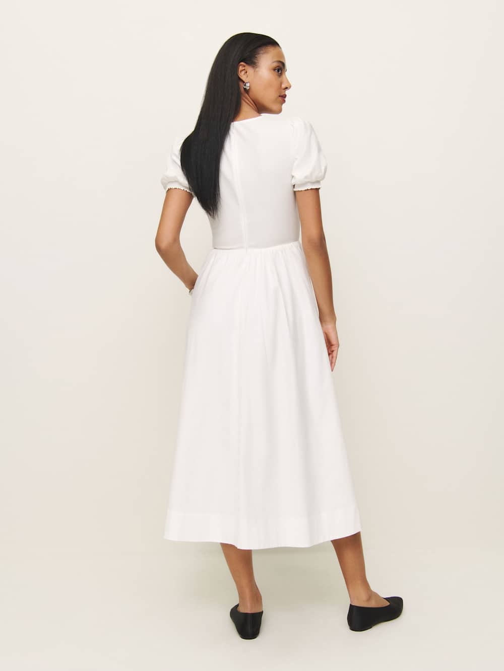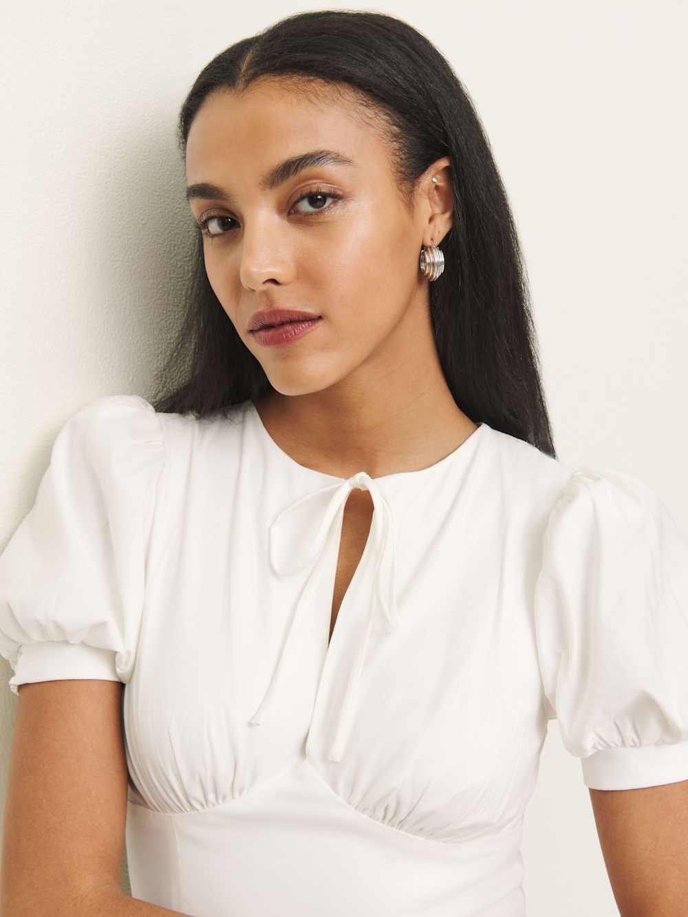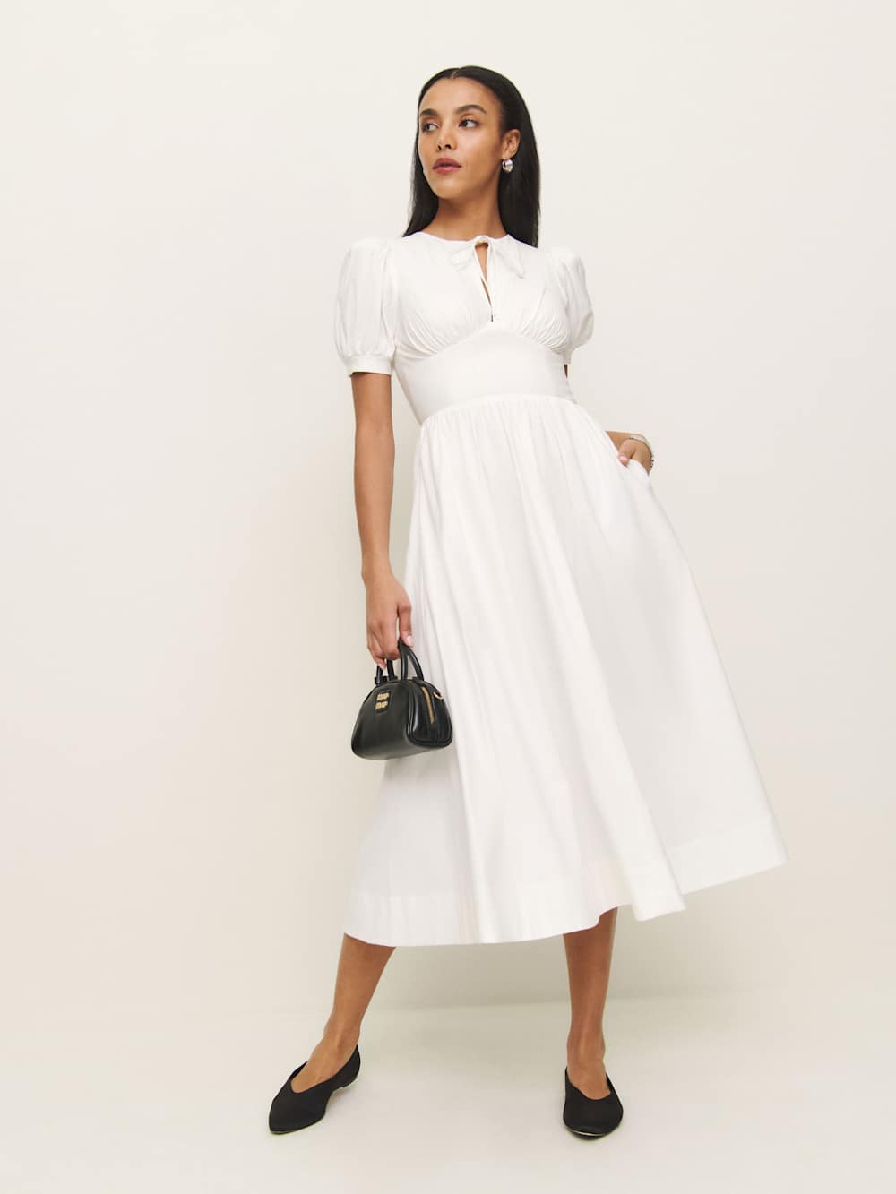 How classic. Shop the Noor Dress from Reformation, a midi dress with short puff sleeves, ruching at the bust, and a keyhole cutout at the neck.