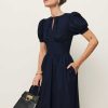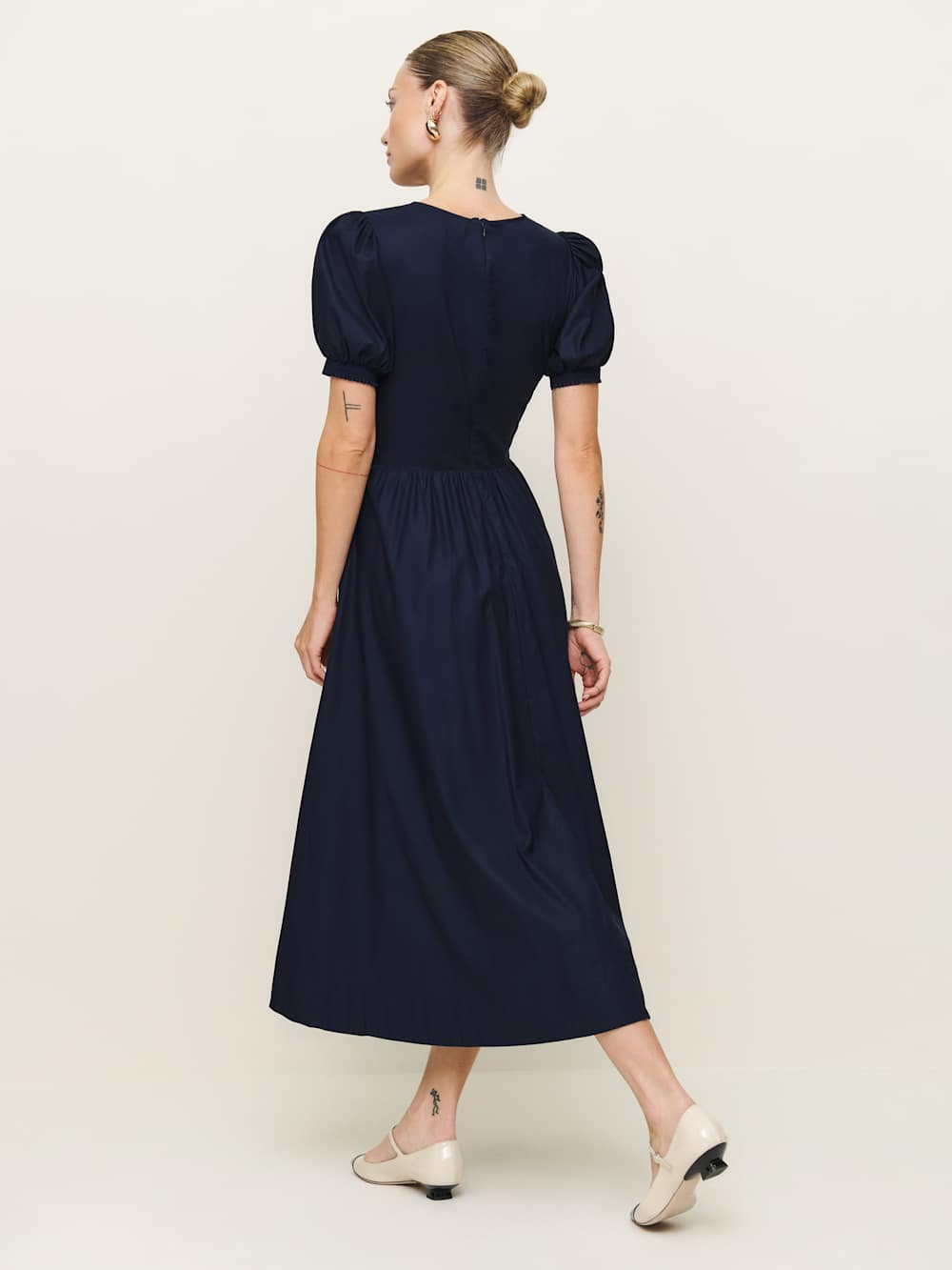 How classic. Shop the Noor Dress from Reformation, a midi dress with short puff sleeves, ruching at the bust, and a keyhole cutout at the neck.