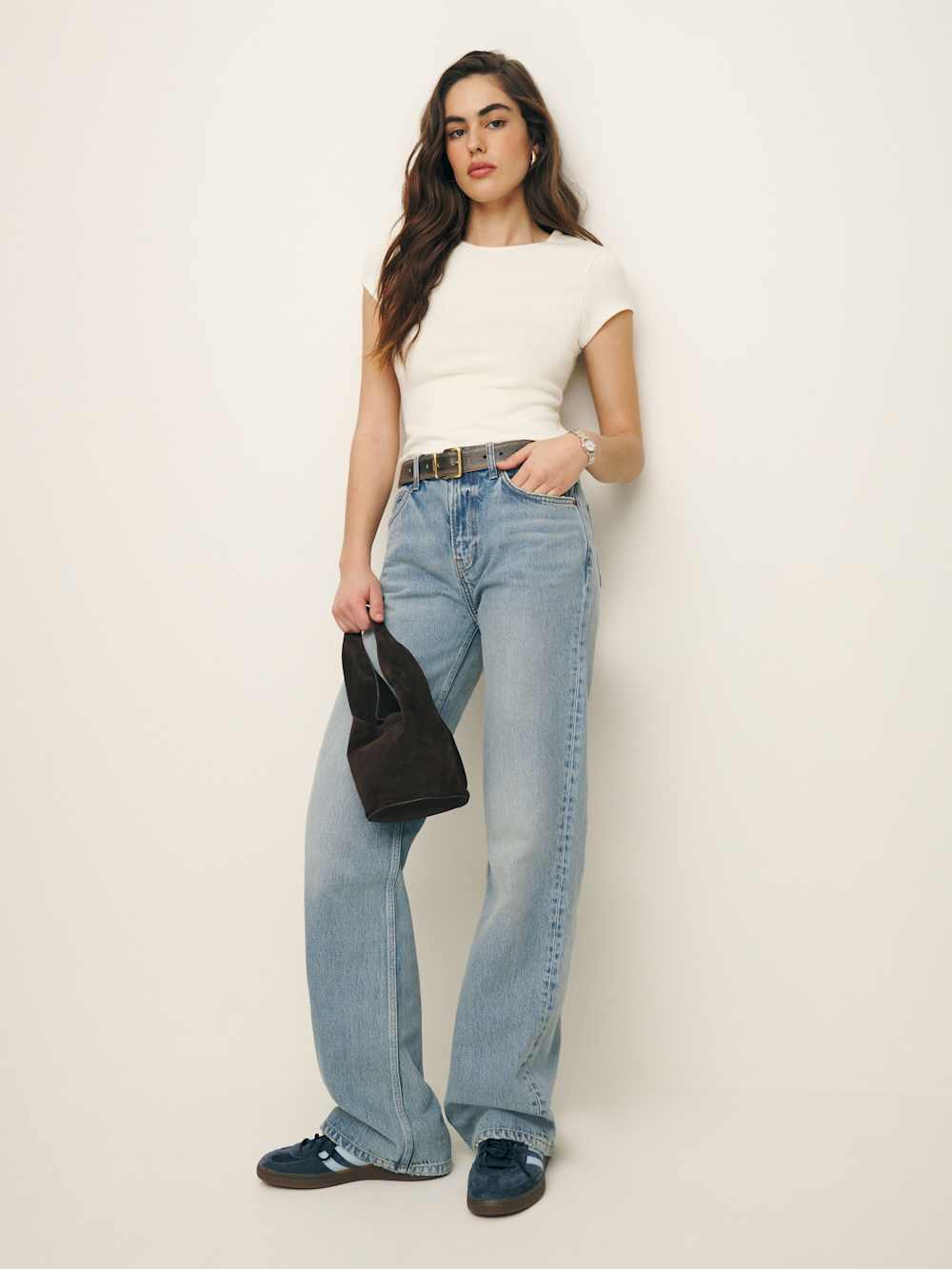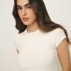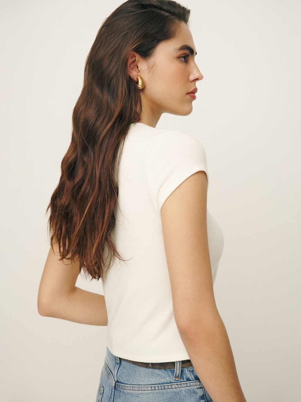 Soft and stretchy if you’re into that. Shop the Olive Knit Top from Reformation, a fitted tee with short sleeves.