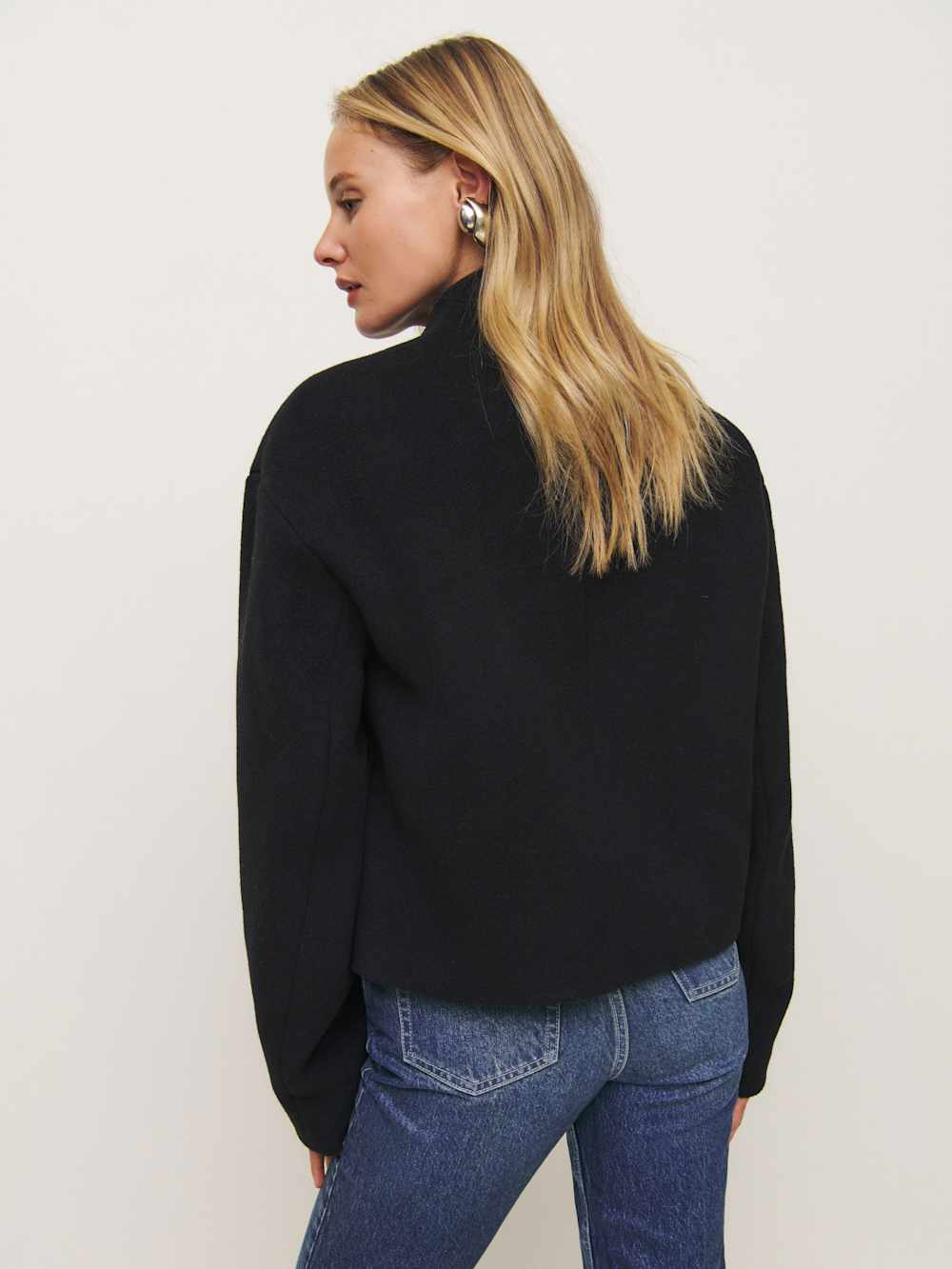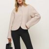 Layer up. Shop the Owen Jacket from Reformation, a collarless jacket with a boxy fit and button front.