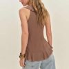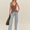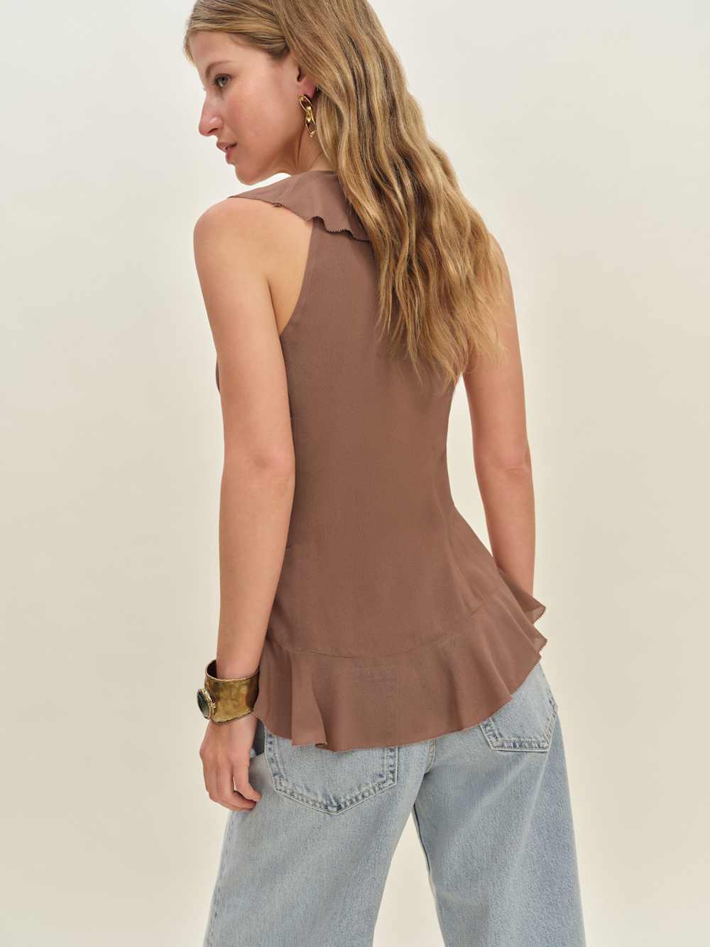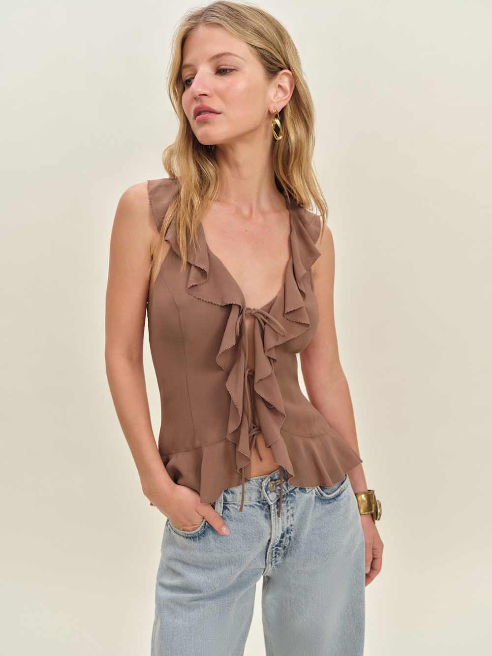 Up top. Shop the Paulette Top from Reformation, a sleeveless top with a deep v-neckline, adjustable ties along the front, and ruffle trim throughout.