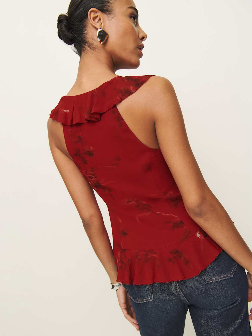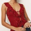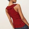 Up top. Shop the Paulette Top from Reformation, a sleeveless top with a deep v-neckline, adjustable ties along the front, and ruffle trim throughout.