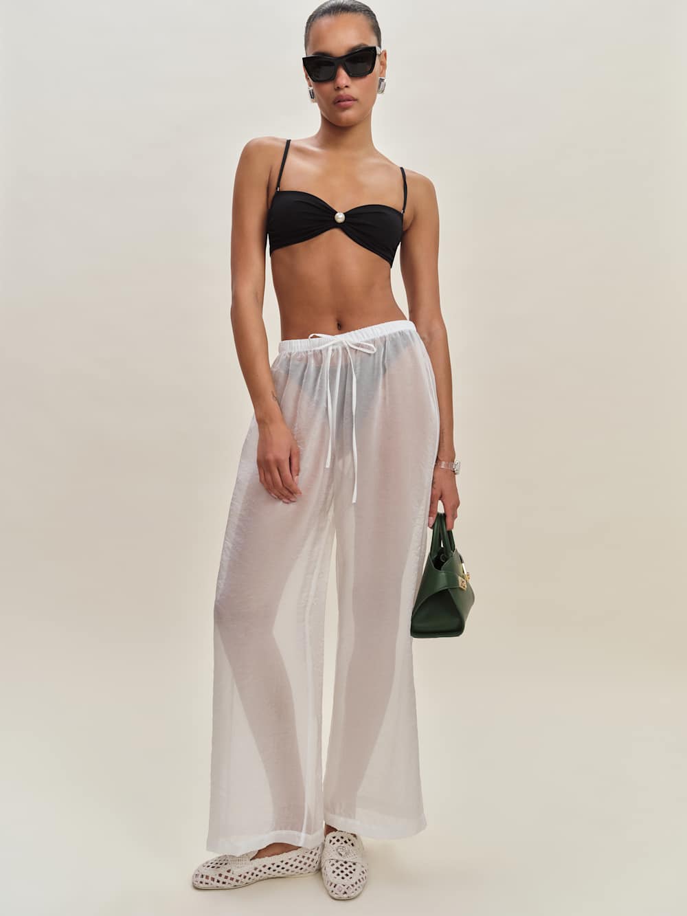 Shop the Perla Bikini Top from Reformation, a sleeveless bikini top with a sweetheart neckline, ruching throughout, and pearl detailing.