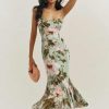 How dreamy. Shop the Petites Aiko Dress from Reformation, a midi-length dress with a sweetheart neckline, ruffling at the neckline, and a pleated hem.
