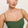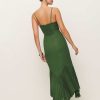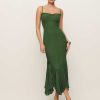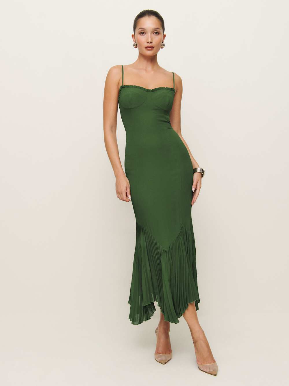 How dreamy. Shop the Petites Aiko Dress from Reformation, a midi-length dress with a sweetheart neckline, ruffling at the neckline, and a pleated hem.