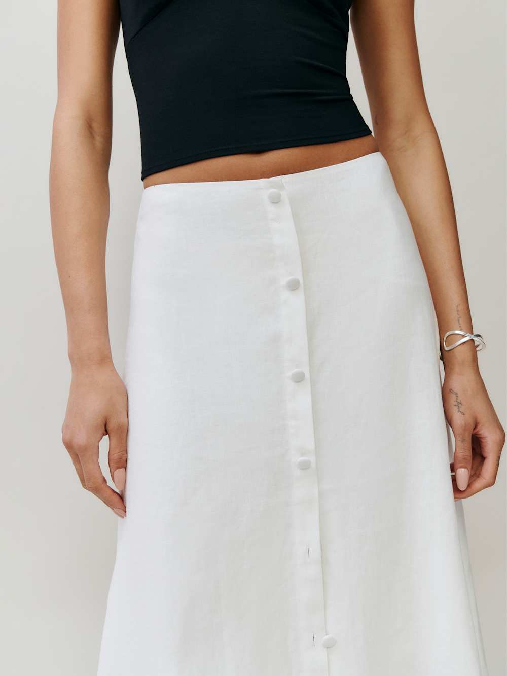 Wear the skirt. Shop the Petites Andi Linen Maxi Skirt from Reformation, a maxi skirt with a high rise and button front.