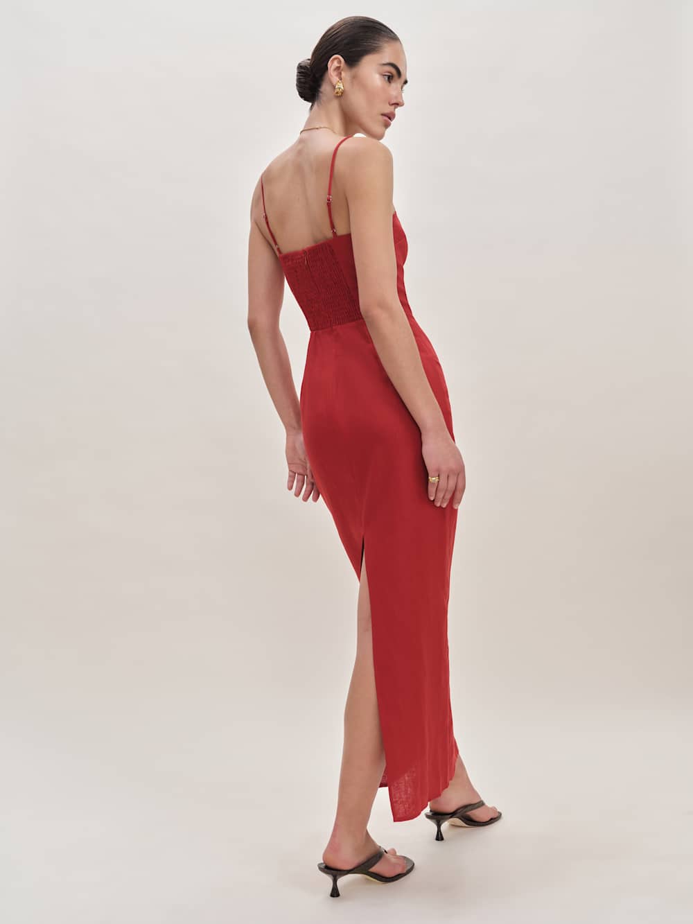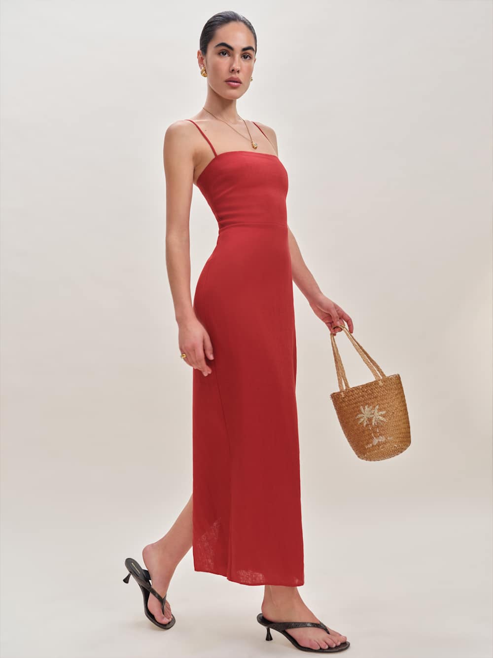 Wear me. Shop the Petites Frankie Linen Dress from Reformation, a slim-fitting dress with a straight neckline, non-adjustable straps and a center back slit.