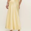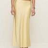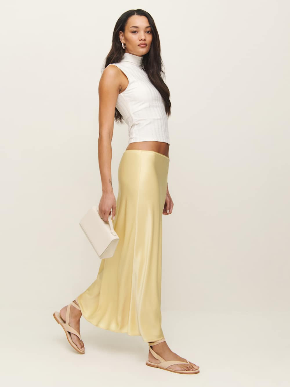 Wear the skirt. Shop the Petites Layla Satin Skirt from Reformation, a bias cut midi skirt with an elasticated waist that can be worn high or low rise.