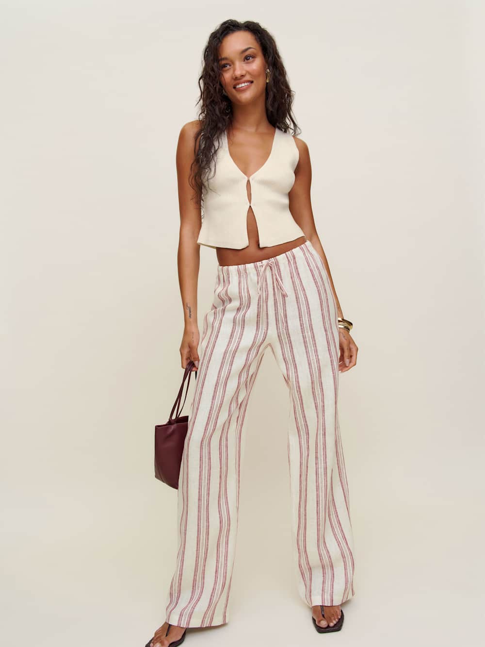 Wear the pants. Shop the Petites Olina Linen Pant from Reformation, a relaxed fitting pant with a fitted and drawstring waist.